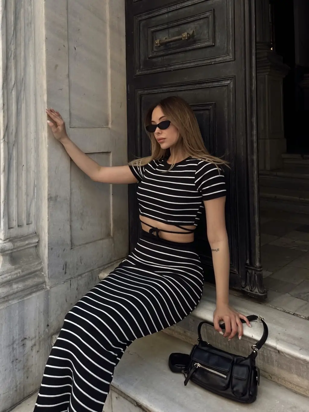 Bu siyah çizgili etekli takım, şıklık ve rahatlığı bir arada sunuyor. Hem günlük kullanıma hem de özel davetlere uygun olan bu takım, gardırobunuzun vazgeçilmezi olmaya aday.