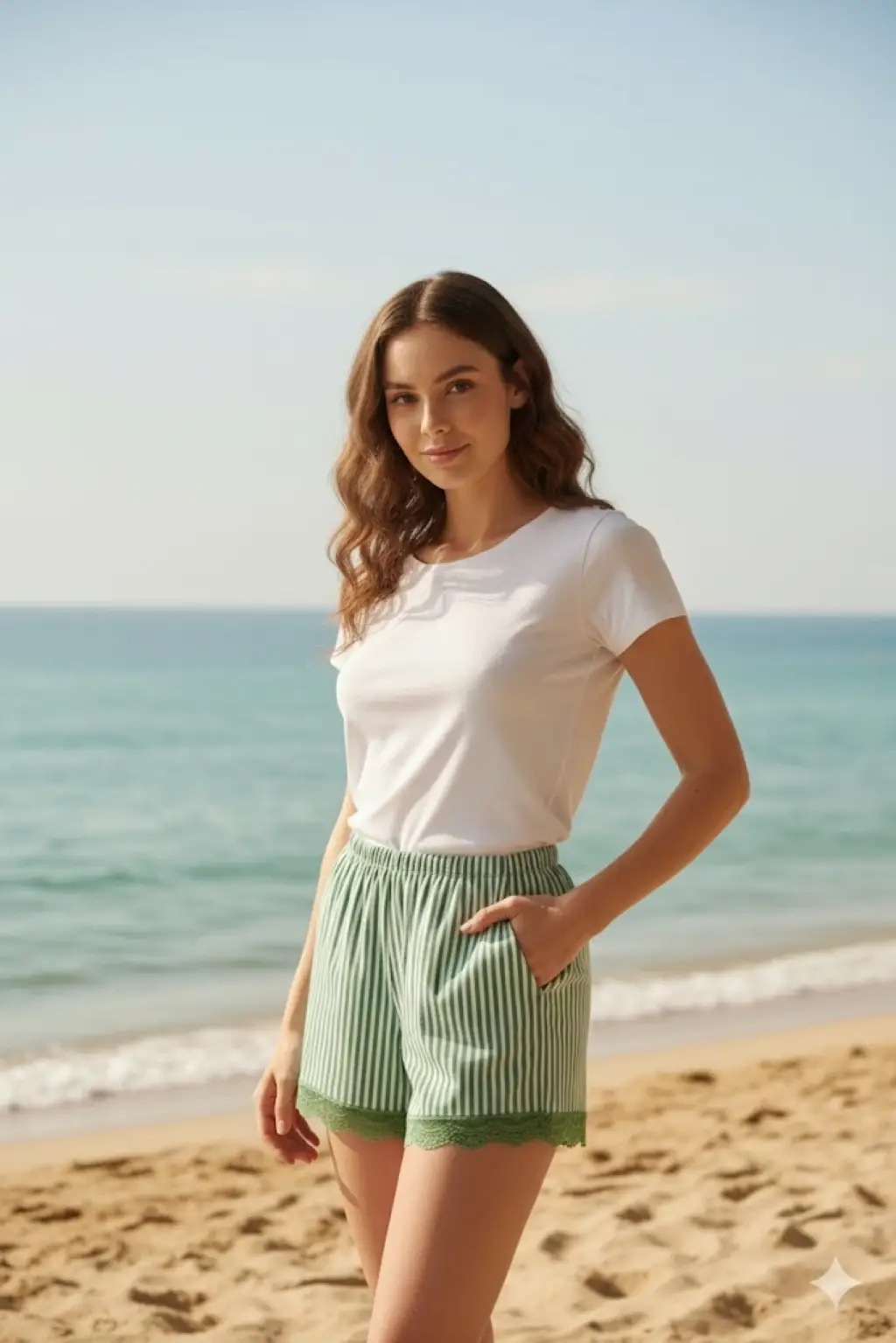 Çizgili Penye Kadın Ev Şortu Bacak Dantel Detaylı Ev Giyim Yeşil