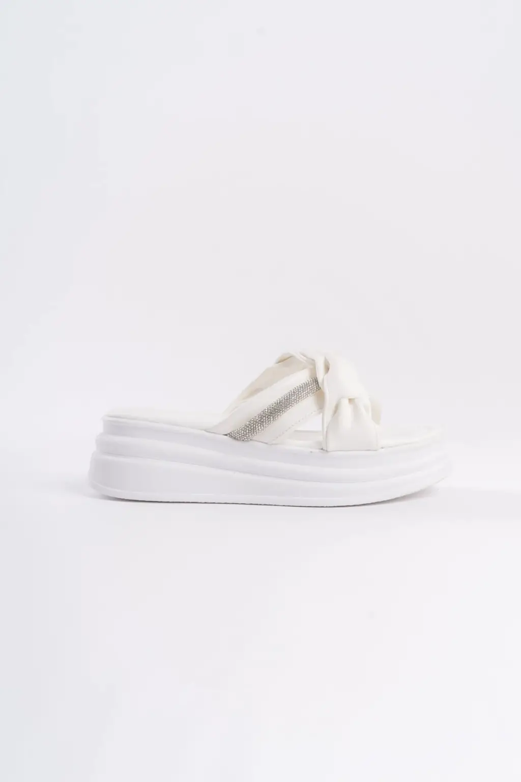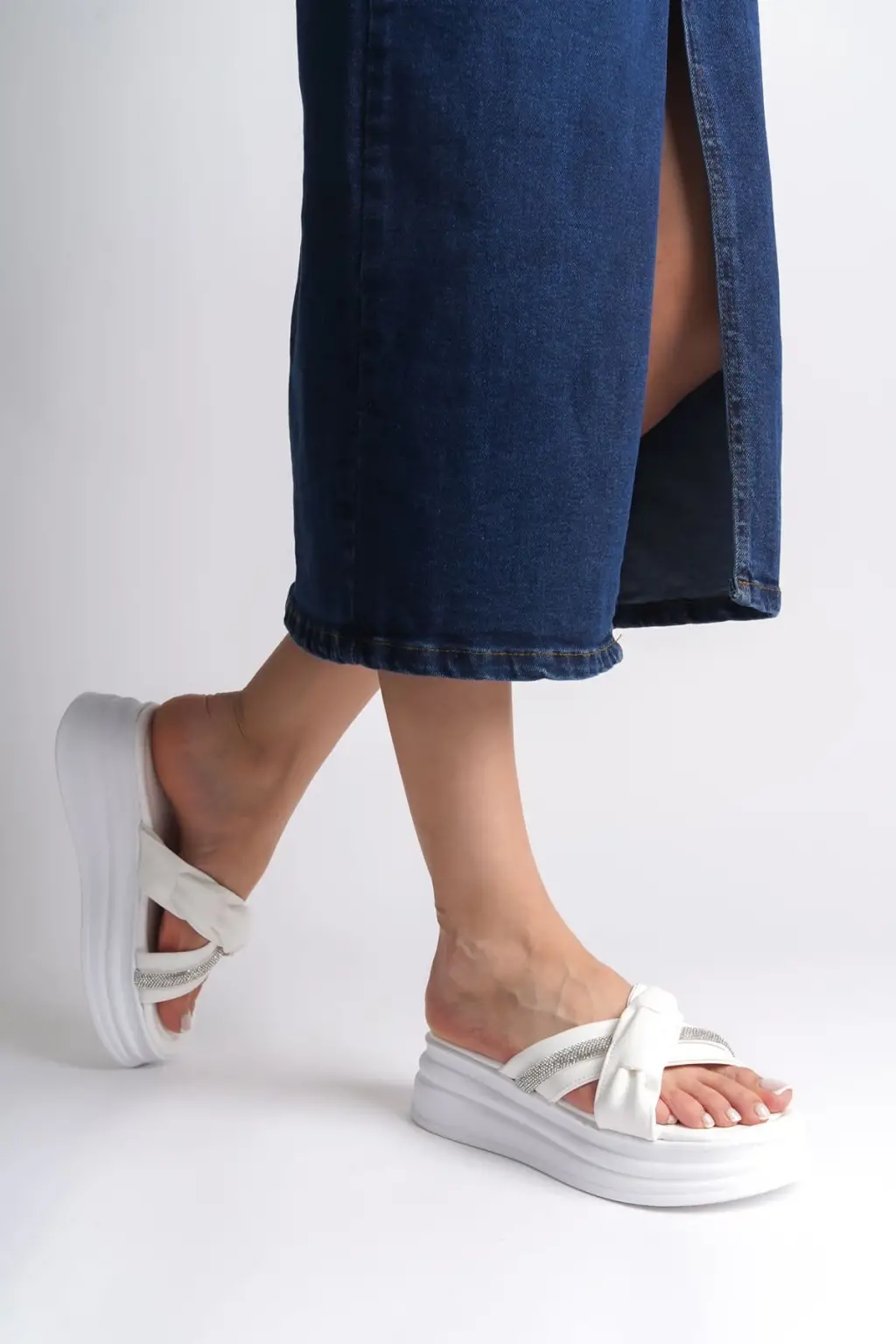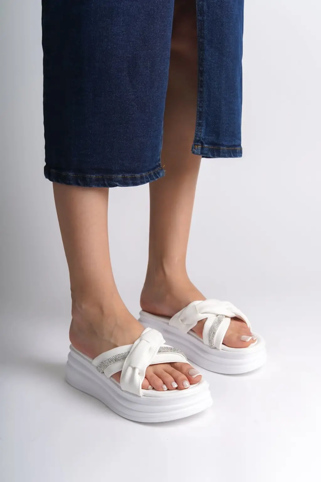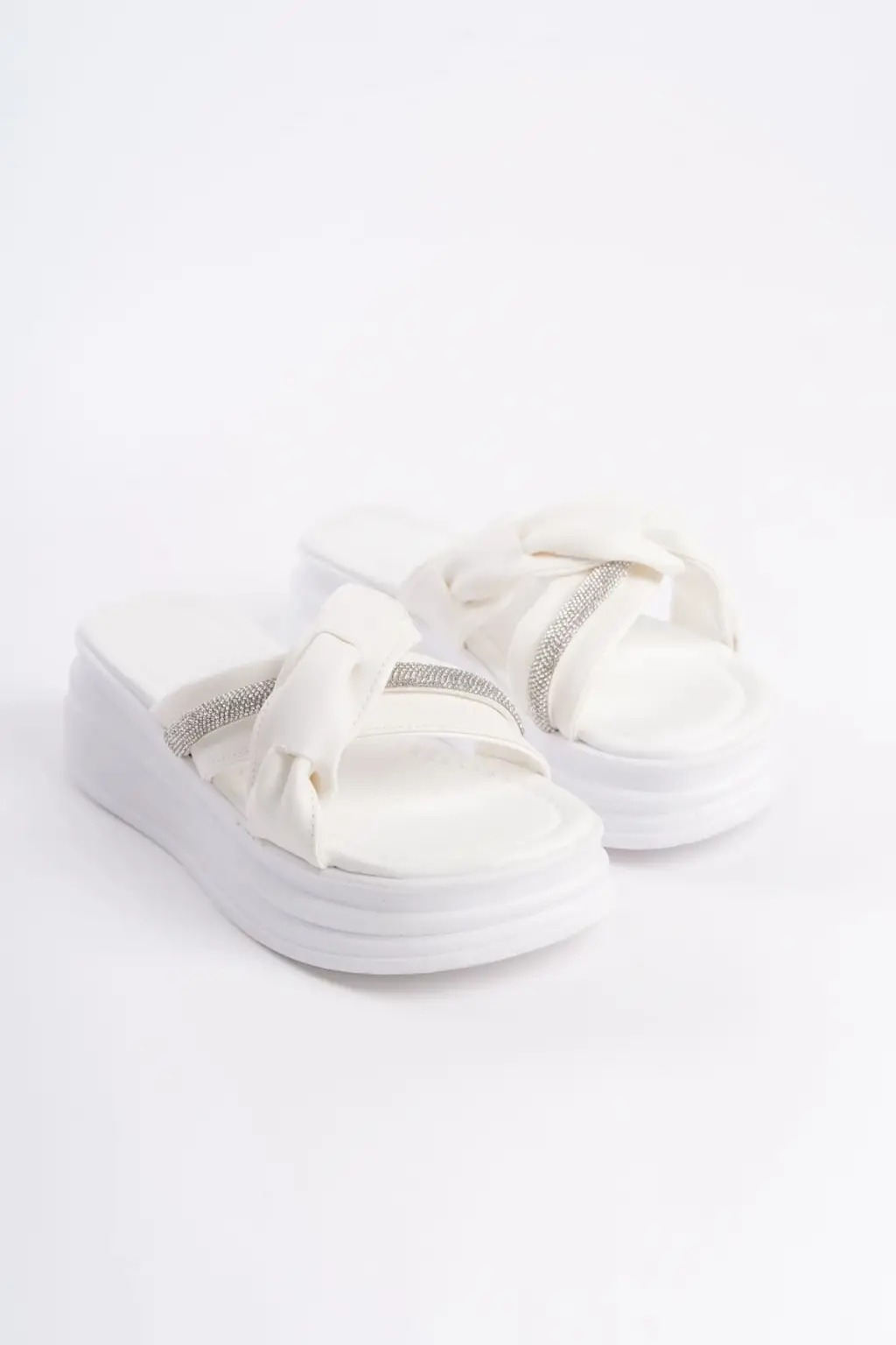 CLARA Düz Topuklu Kurdele Desenli Taşlı Kalın ve Rahat tabanlı ayakkabı Tabaan Bayan Terlik CBT - Beyaz