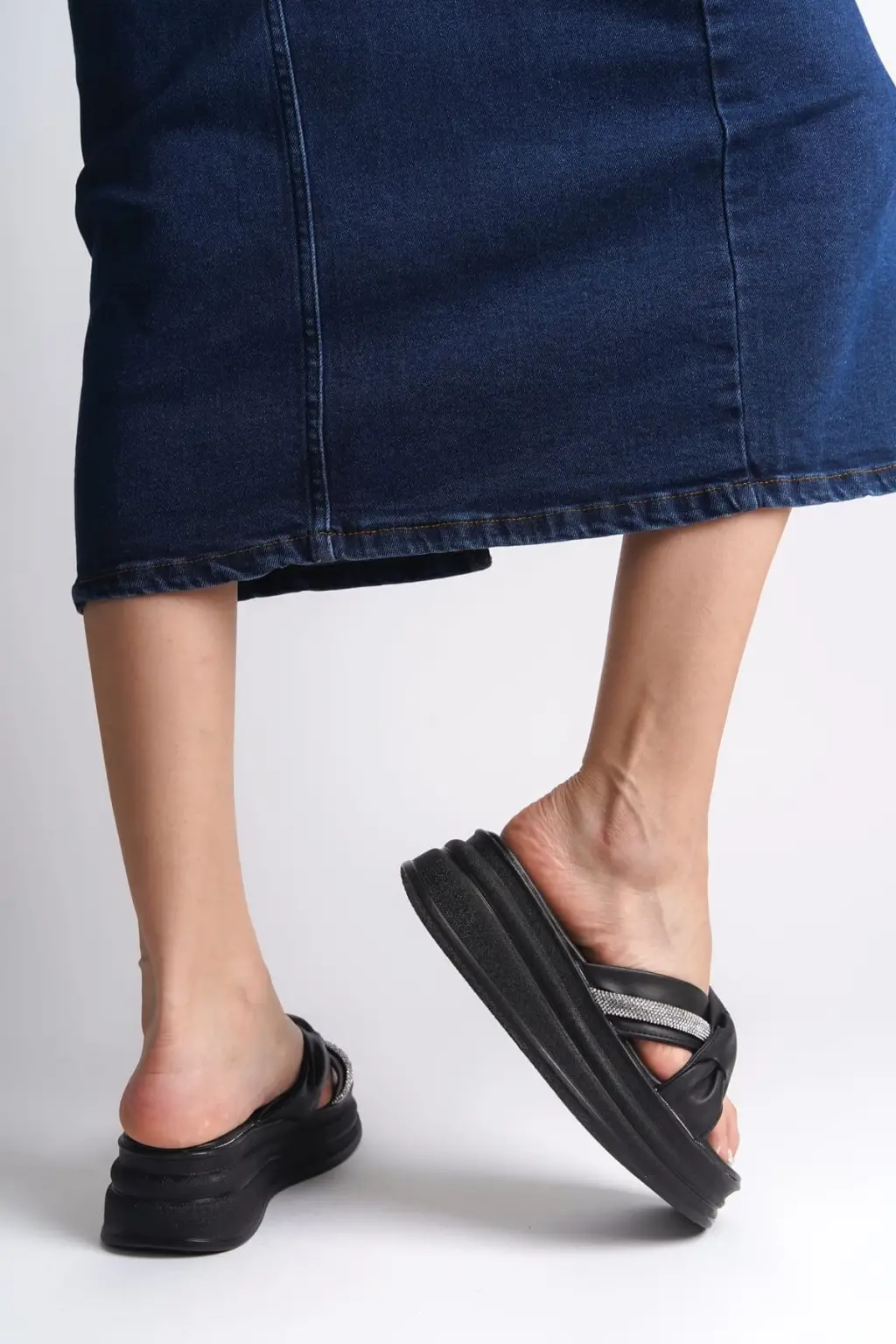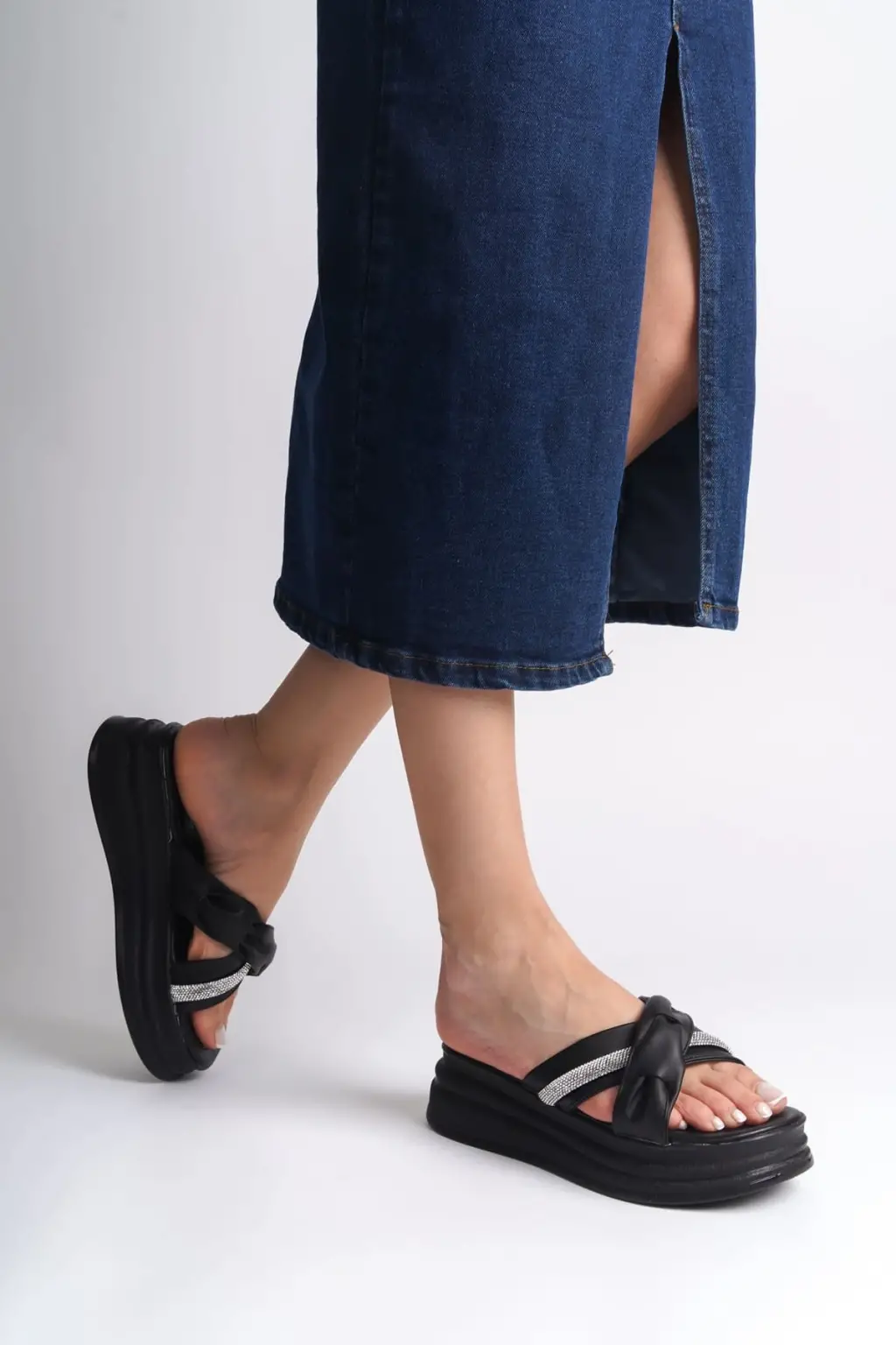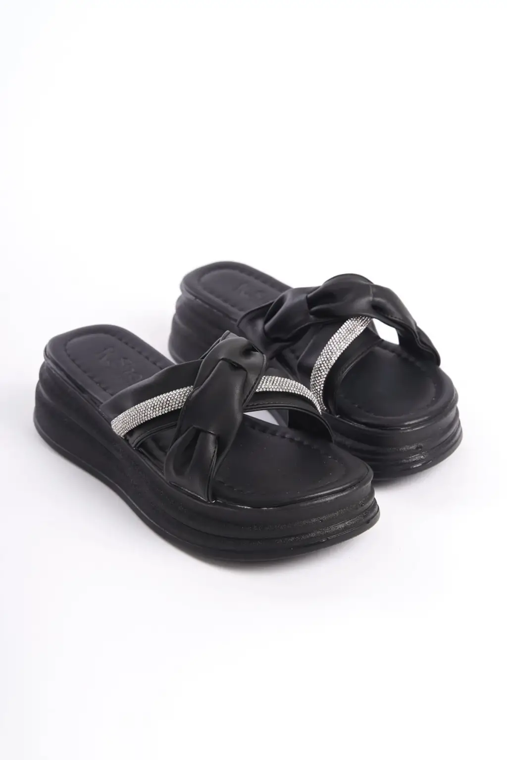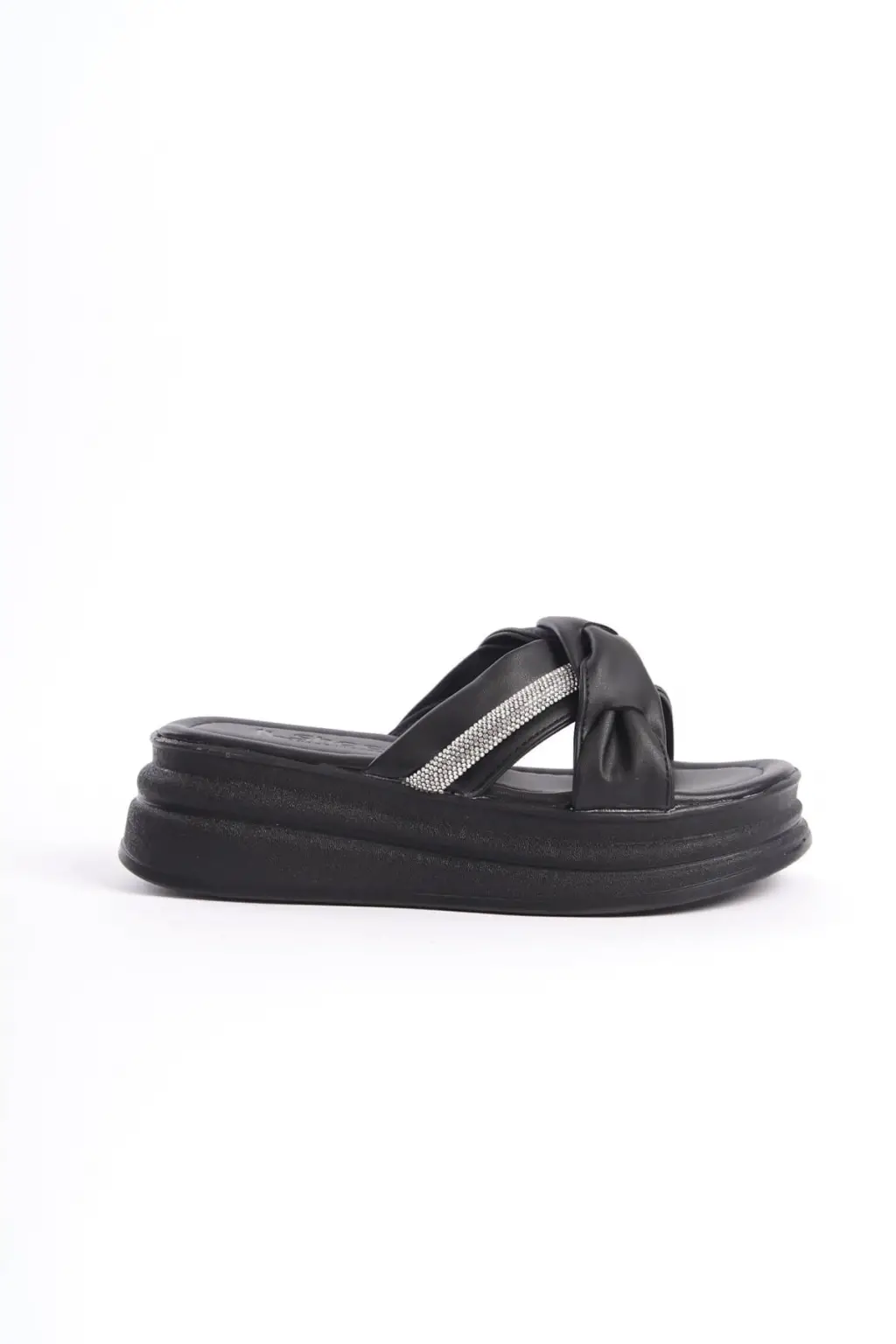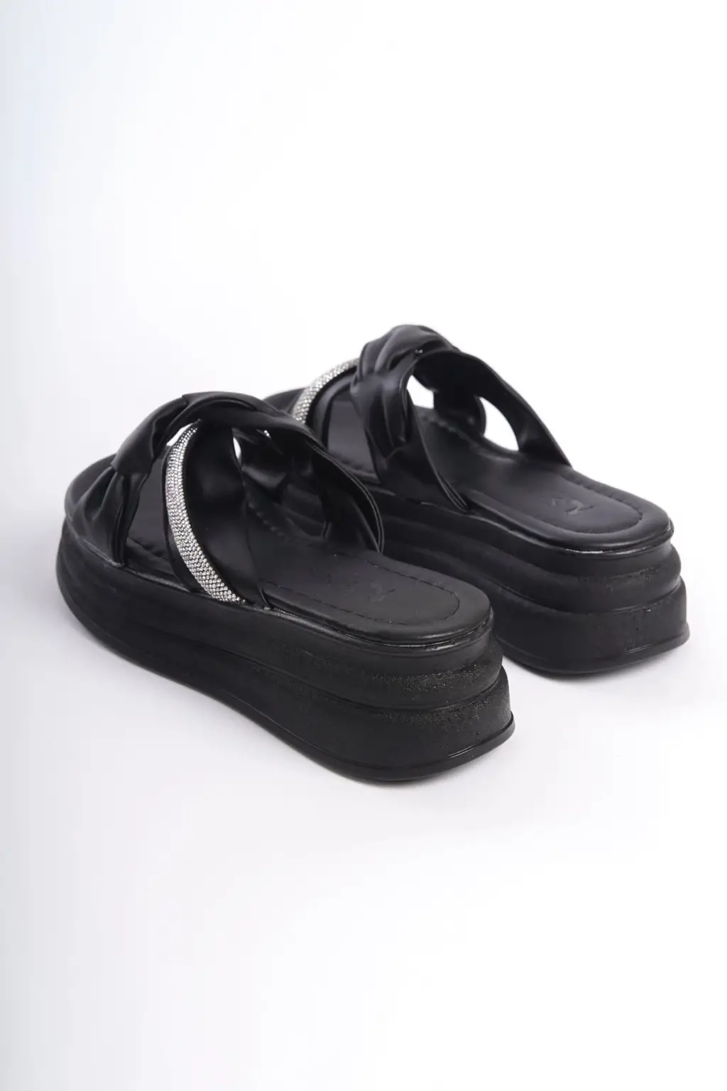 CLARA Düz Topuklu Kurdele Desenli Taşlı Kalın ve Rahat tabanlı ayakkabı Tabaan Bayan Terlik CGünlük Şık - Siyah