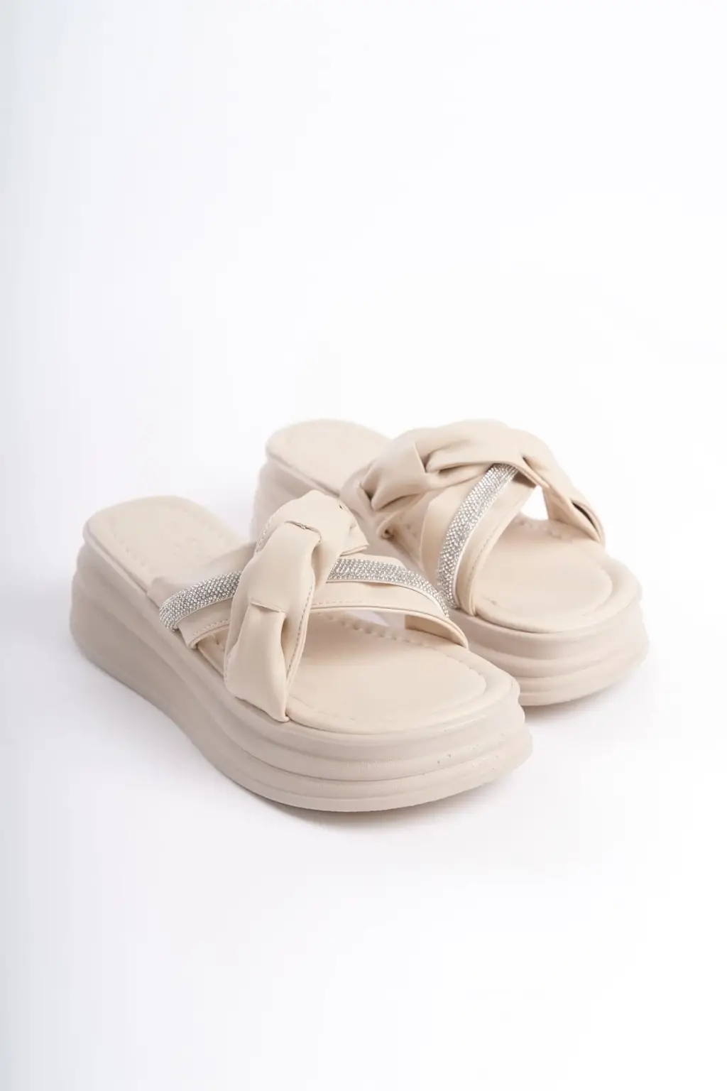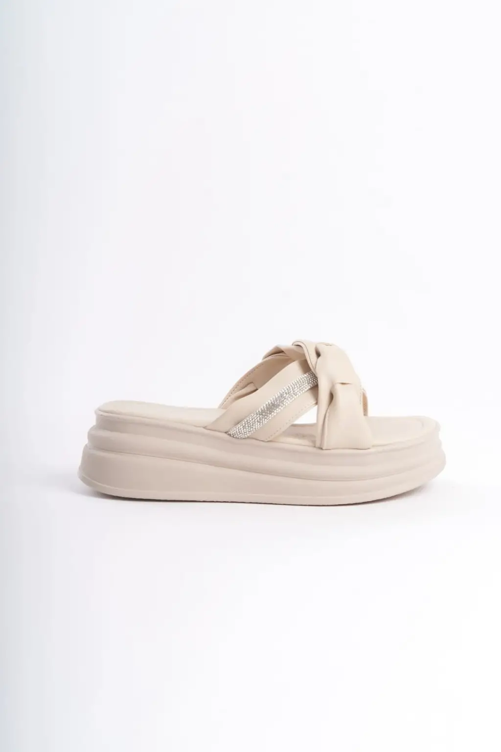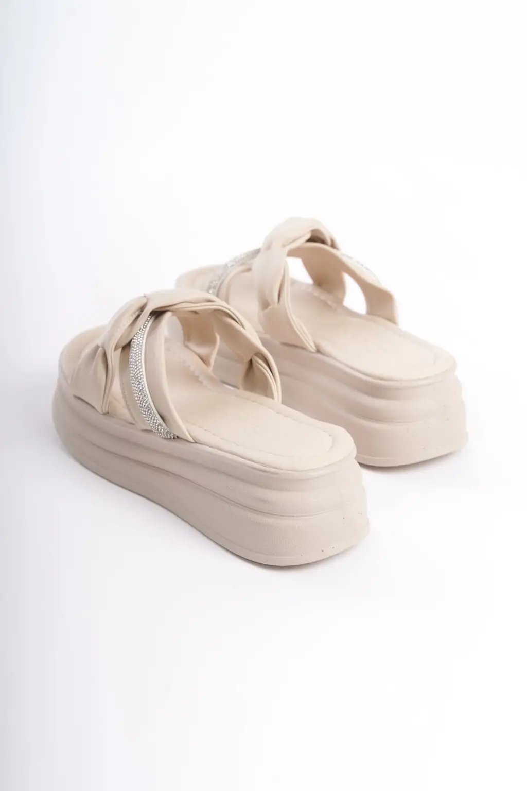 CLARA Düz Topuklu Kurdele Desenli Taşlı Kalın ve Rahat tabanlı ayakkabı Tabaan Bayan Terlik CKısa Topuk - Krem