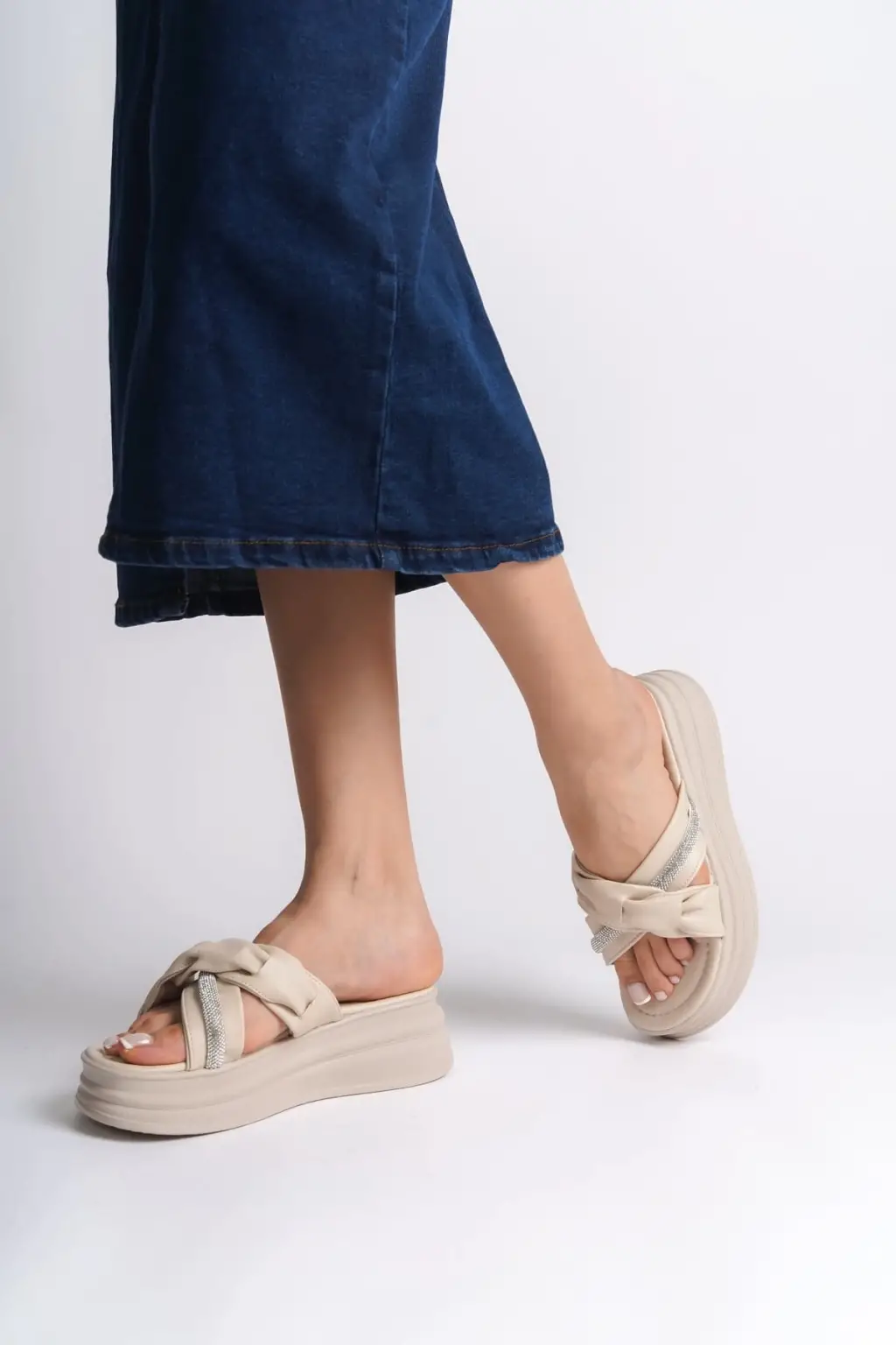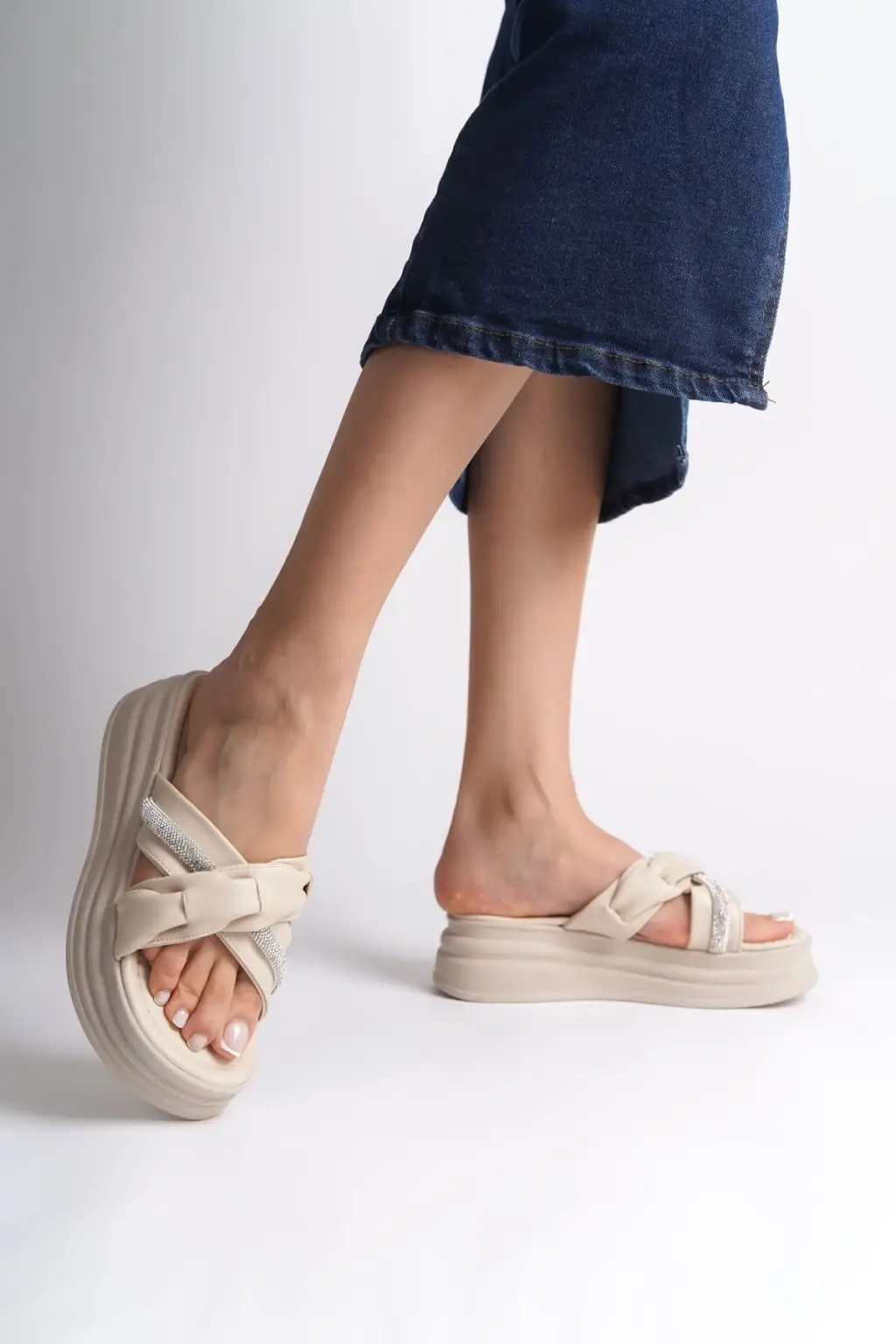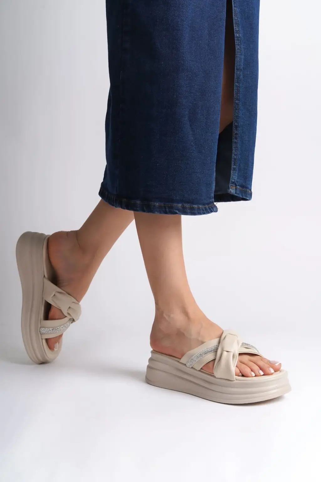 CLARA Düz Topuklu Kurdele Desenli Taşlı Kalın ve Rahat tabanlı ayakkabı Tabaan Bayan Terlik CKısa Topuk - Krem
