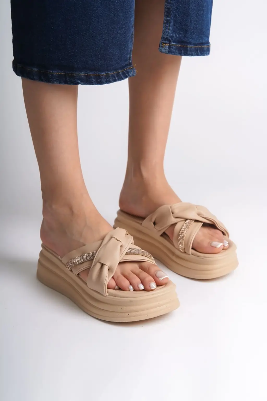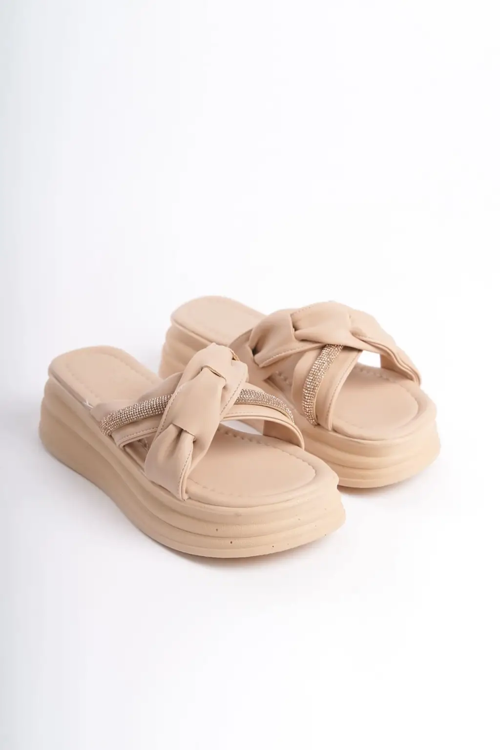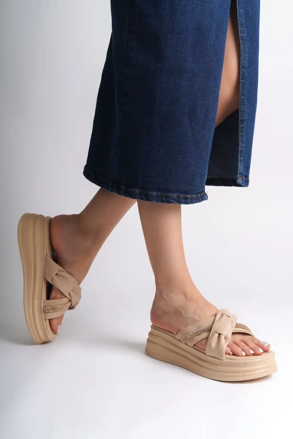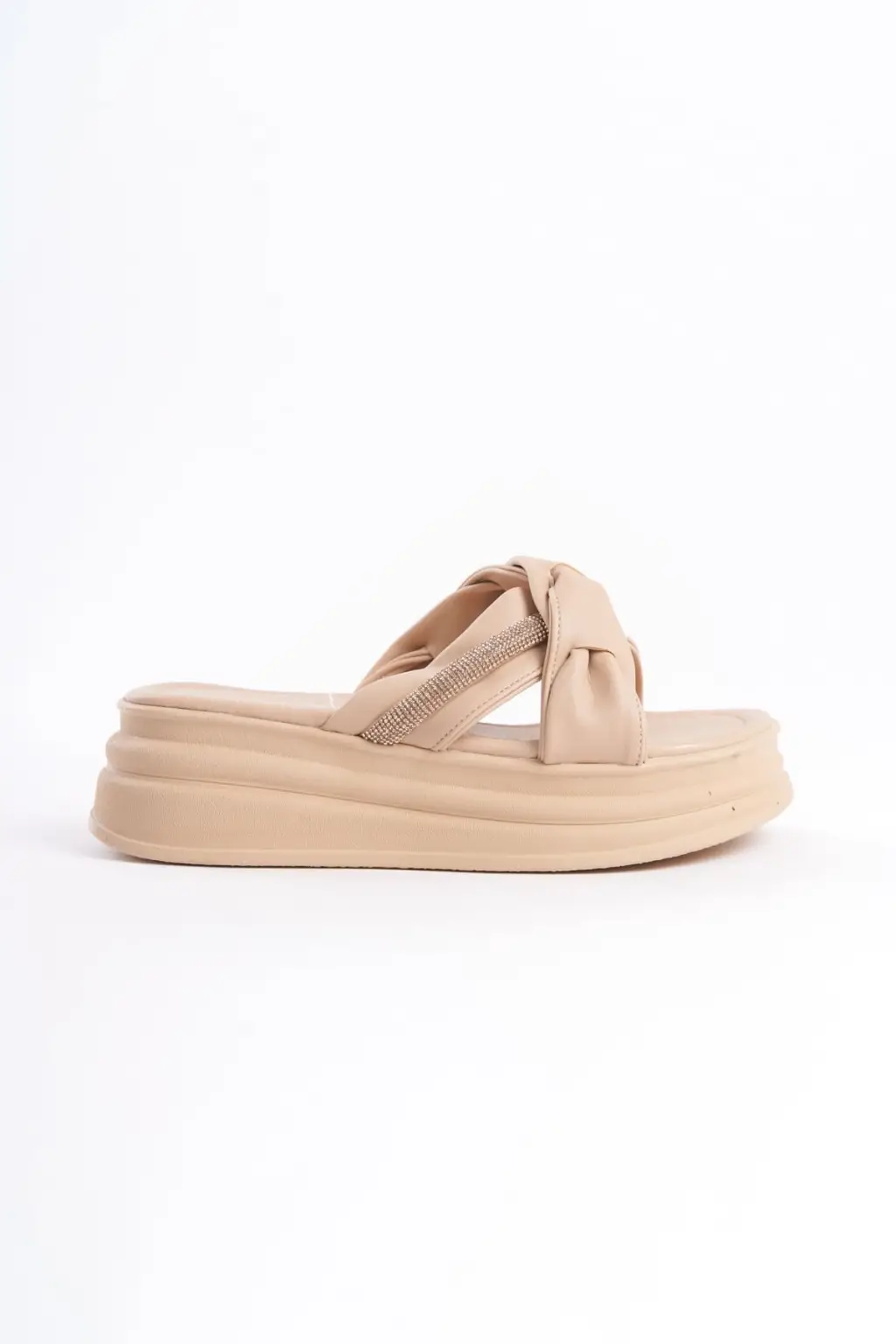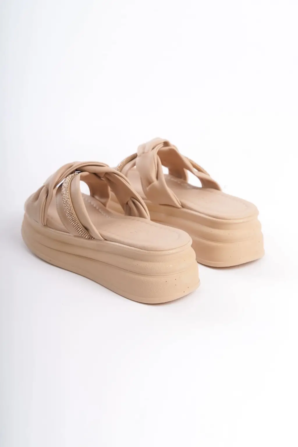 CLARA Düz Topuklu Kurdele Desenli Taşlı Kalın ve Rahat tabanlı ayakkabı Tabaan Bayan Terlik CTT - Ten