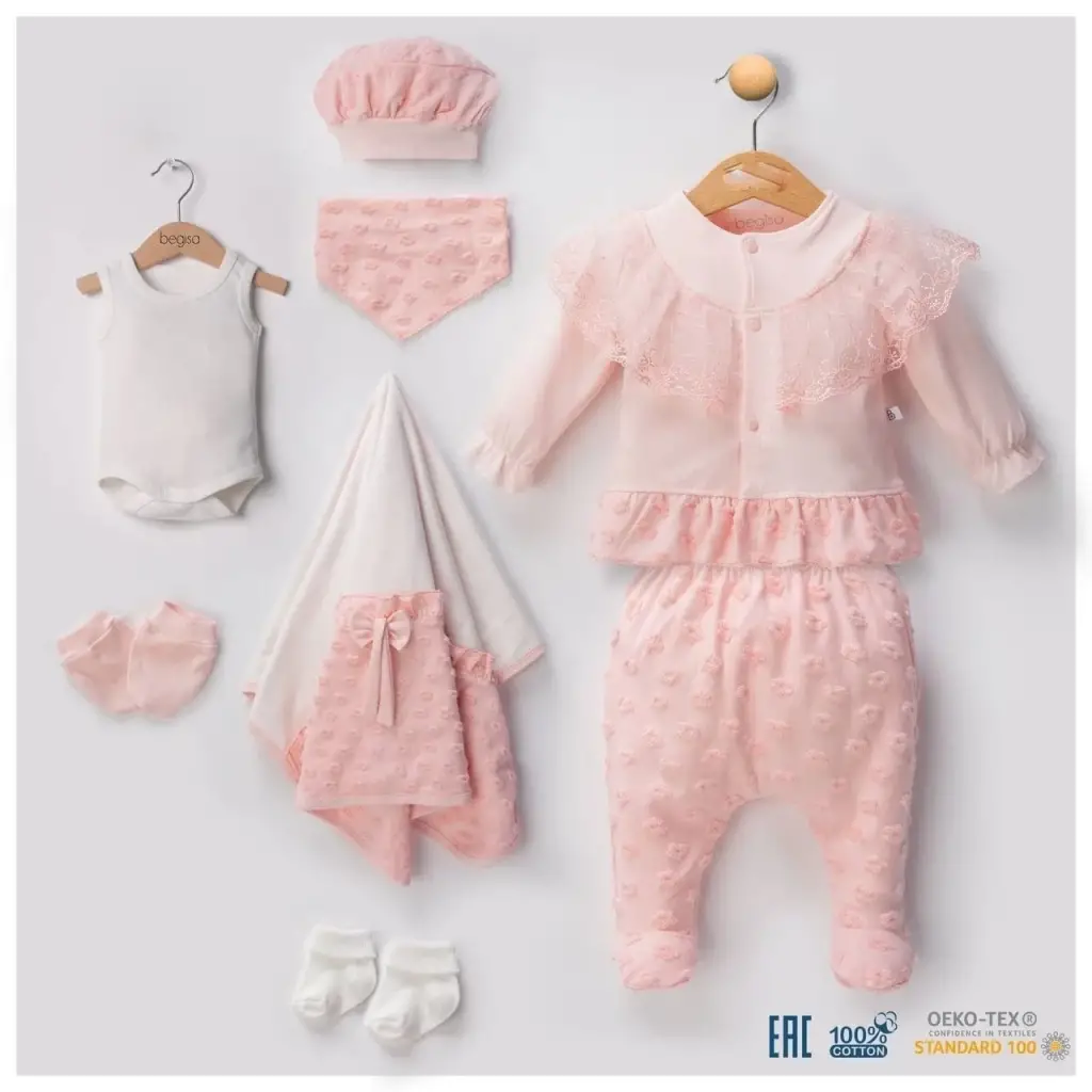 Dantel İşlemeli Kabartmalı 10 Parça Kız Bebek Hastane Çıkışı Kutulu %100 Pamuk