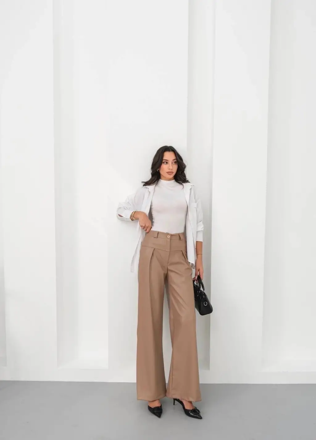 Deri geniş paça beli lastikli pantolon bej h263644, hem şık hem de rahat bir seçenektir. İşte bu pantolonun öne çıkan özellikleri: