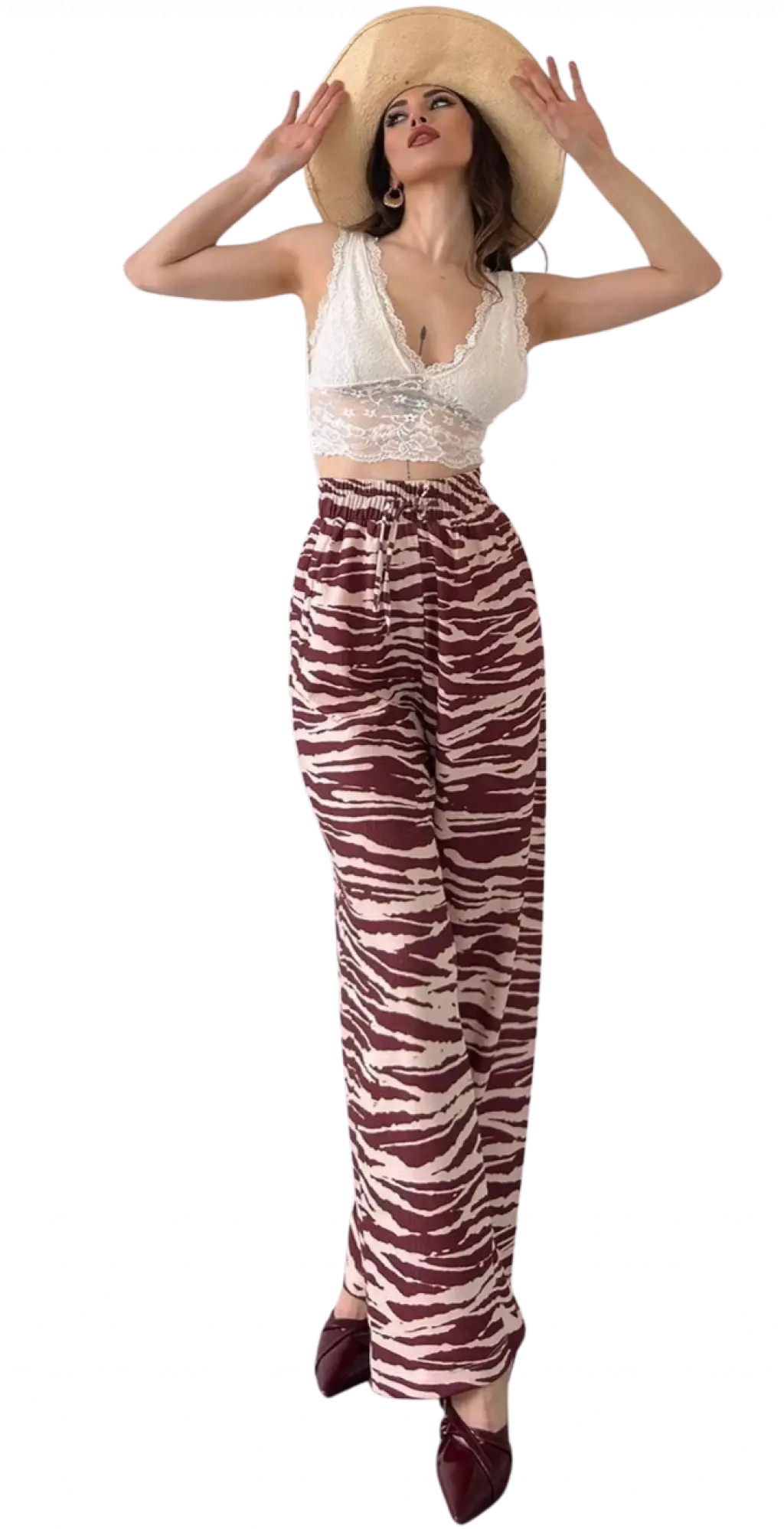 Kadın Yüksek Bel Bağcıklı Yaprak Desenli Süprem Pantolon