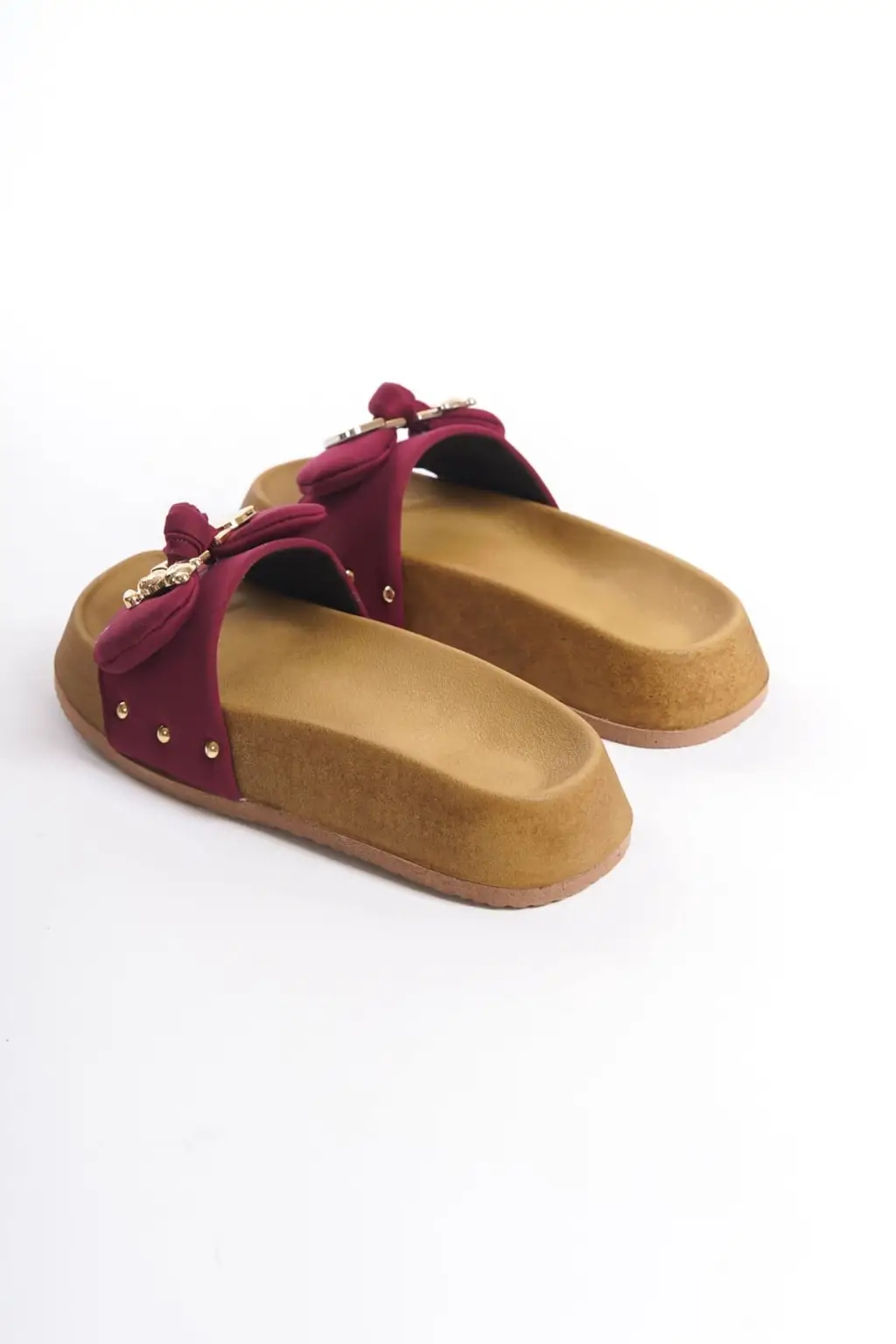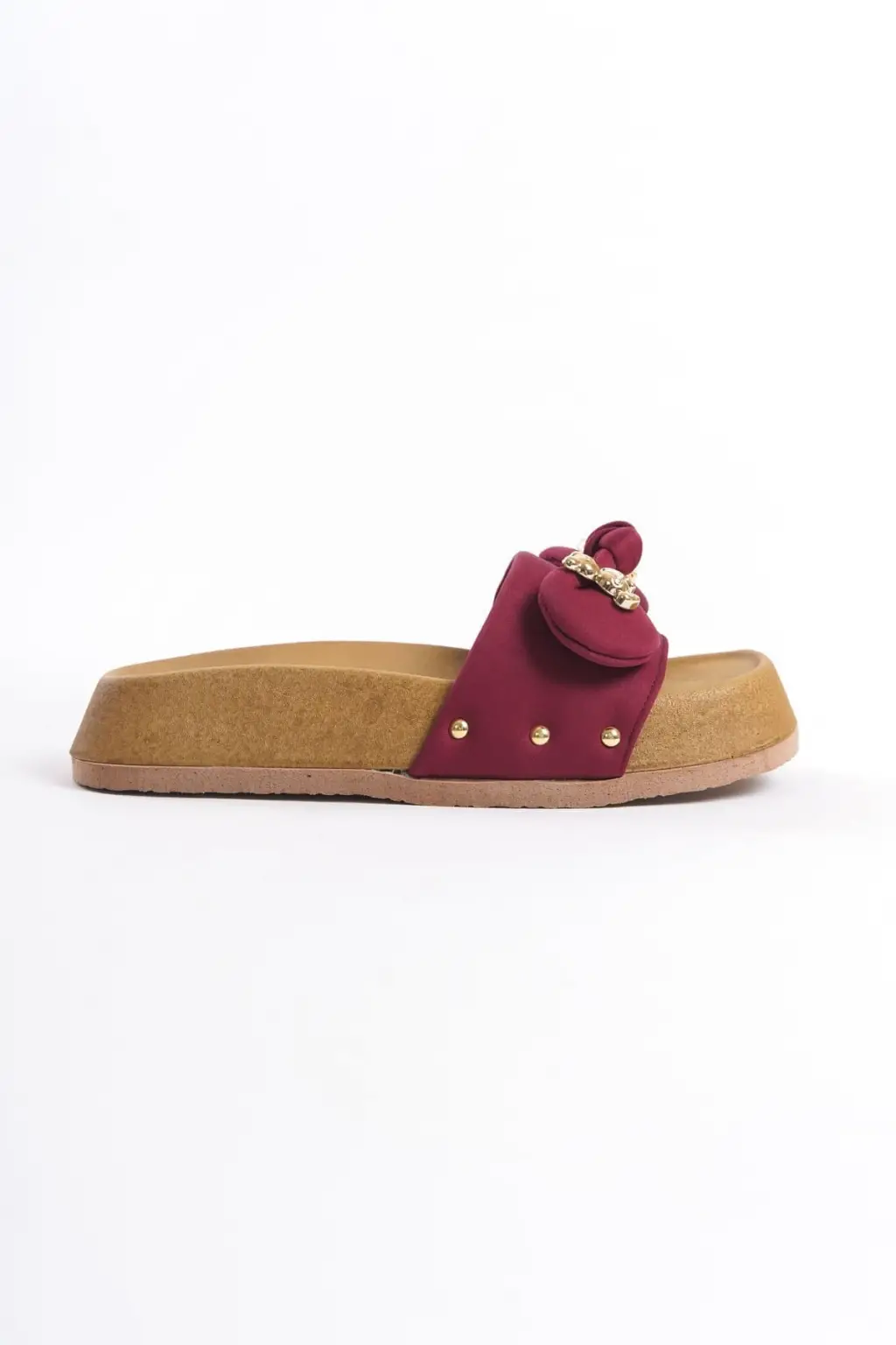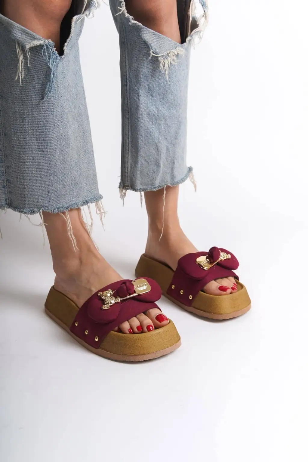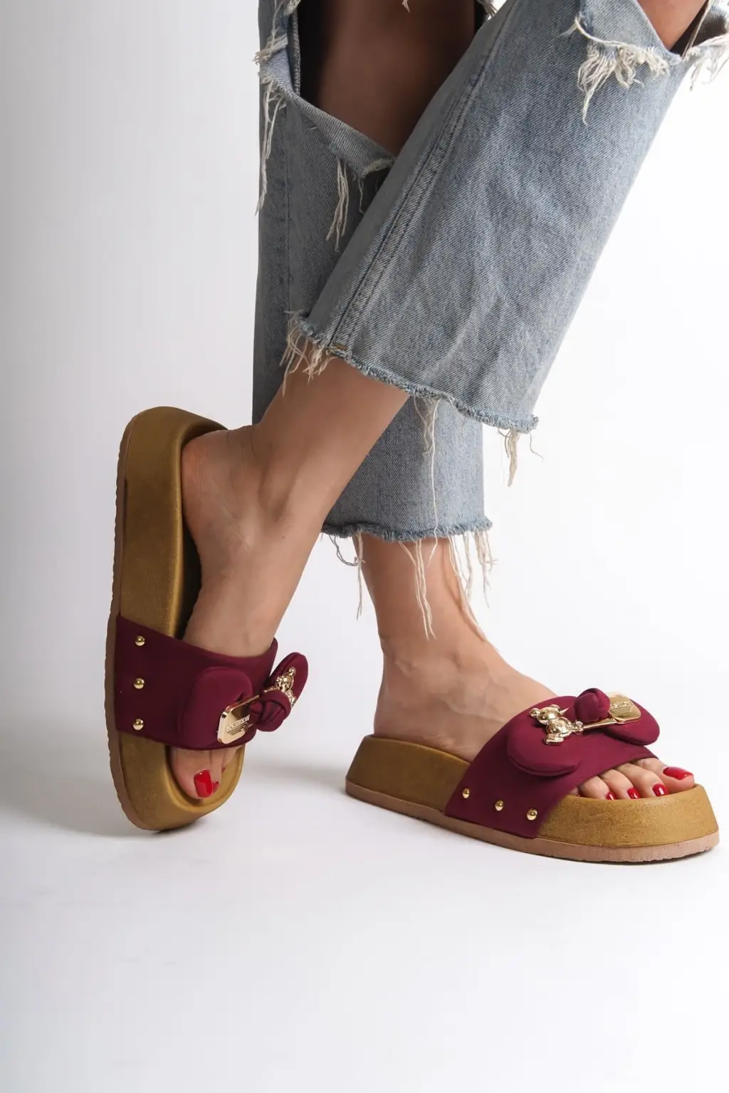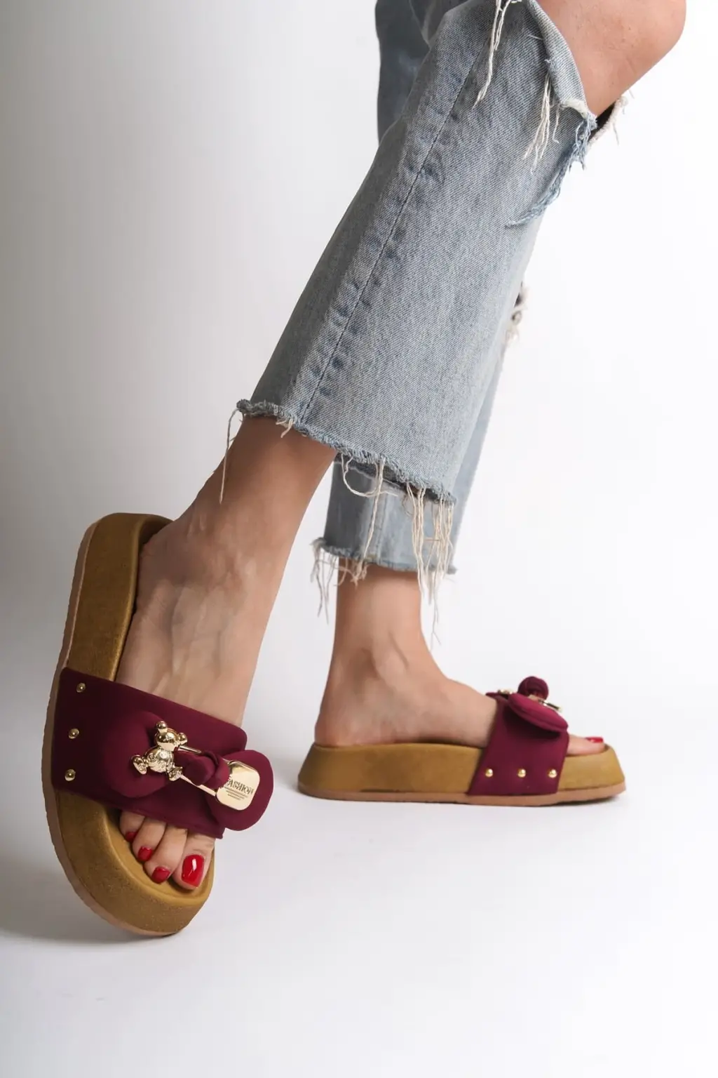 DILA Kalın ve Rahat tabanlı ayakkabı Tabaan Ayıcıklı Saten Bayan Terlik SKısa Topuk - Bordo