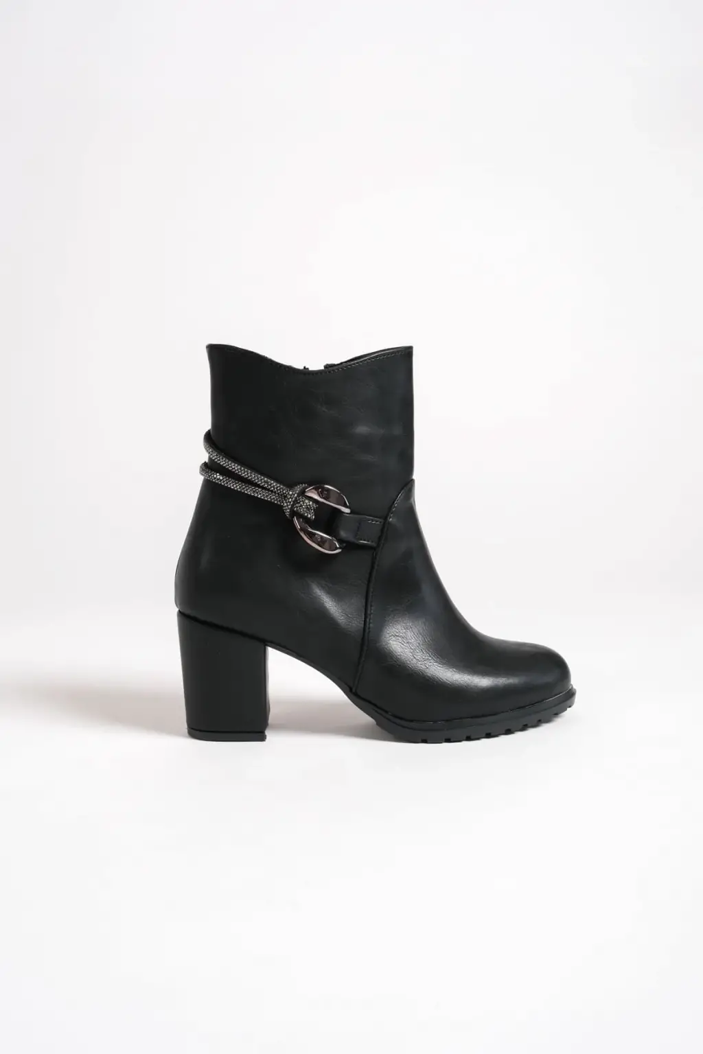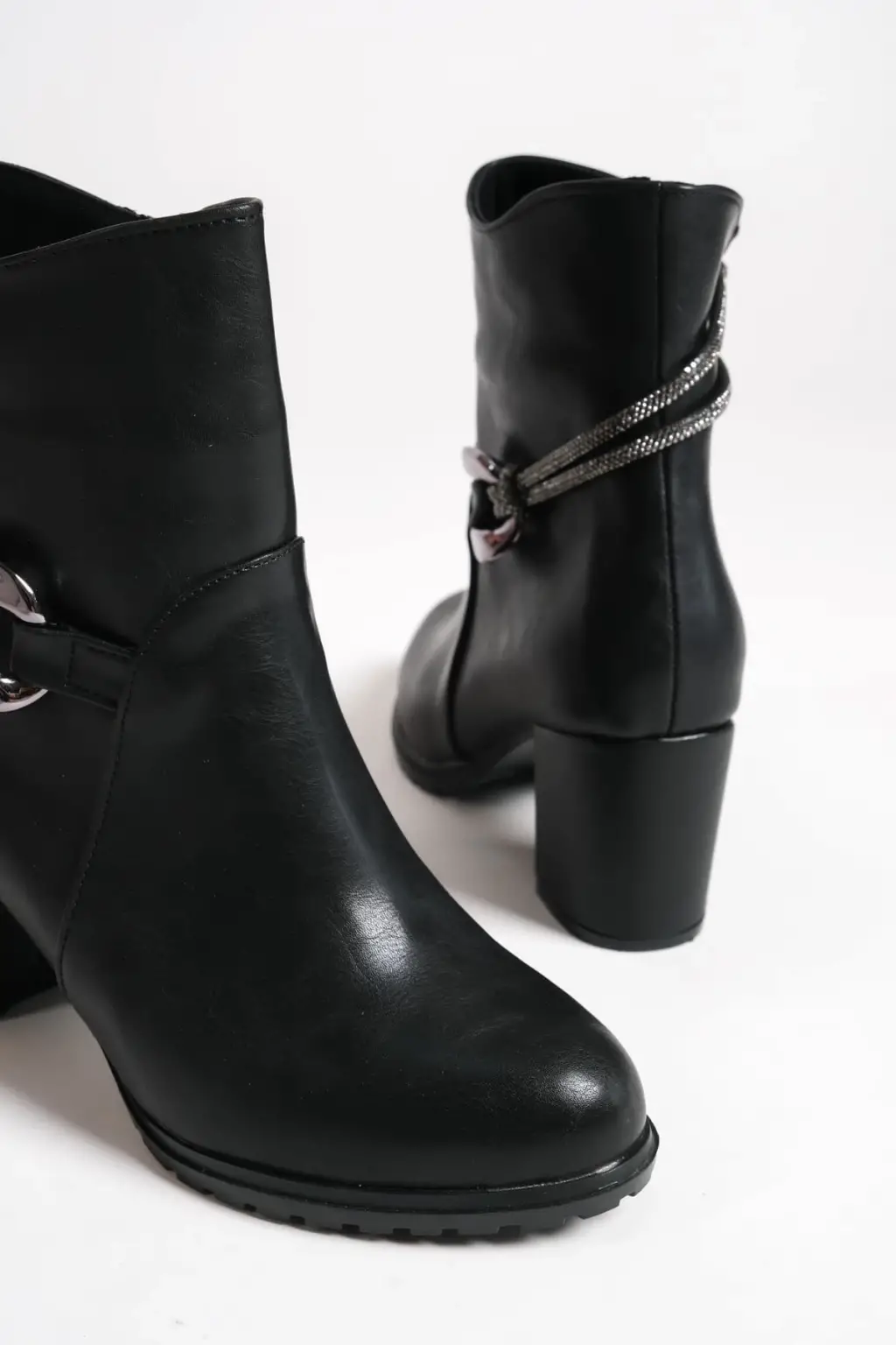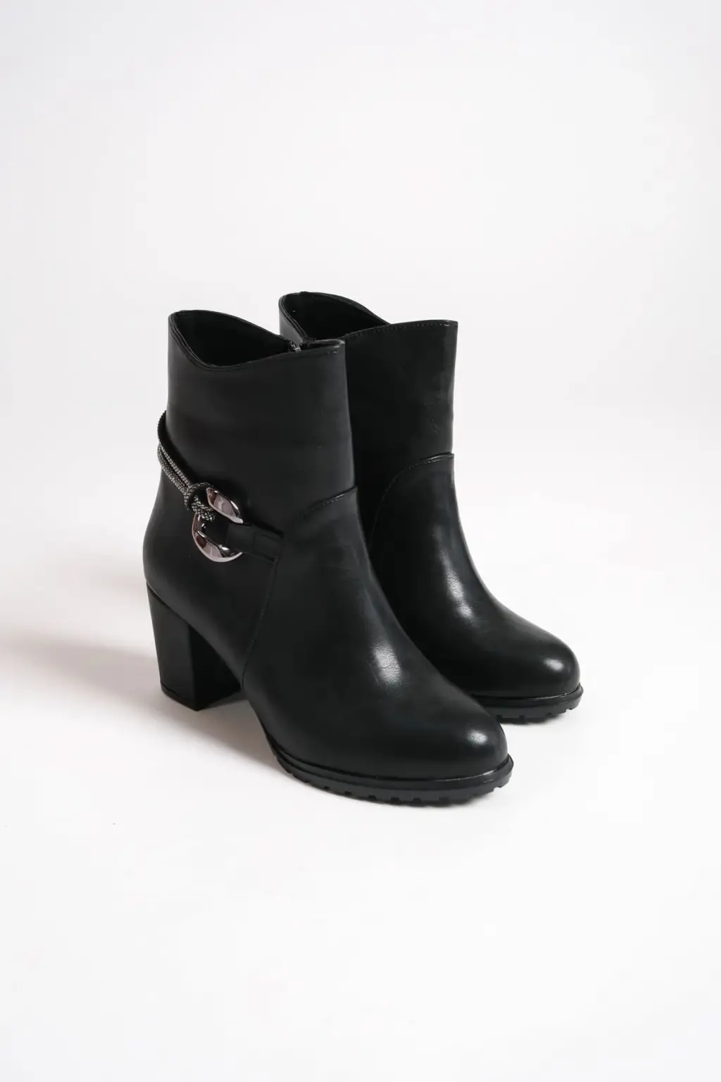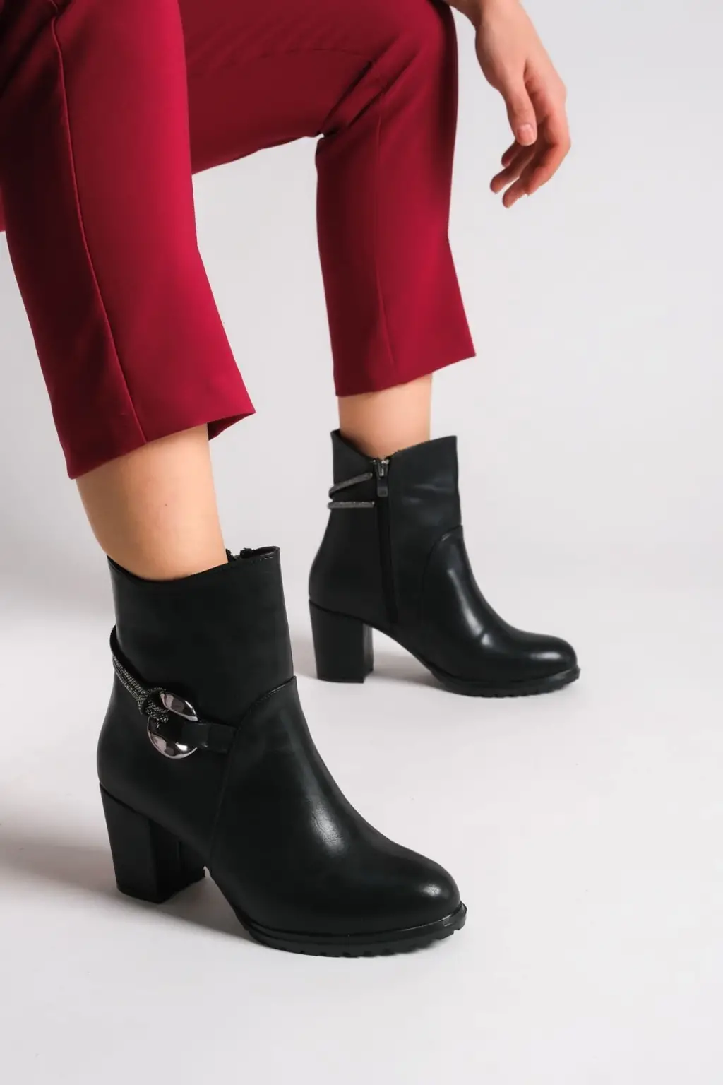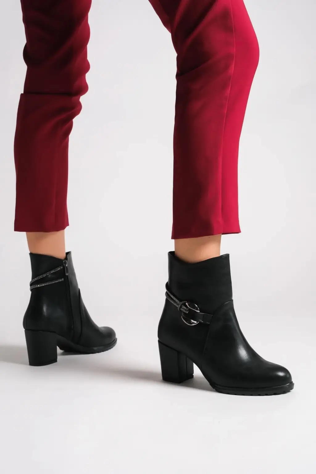 Omarı Fermuarlı Taşlı Topuklu Bayan Bot - Siyah