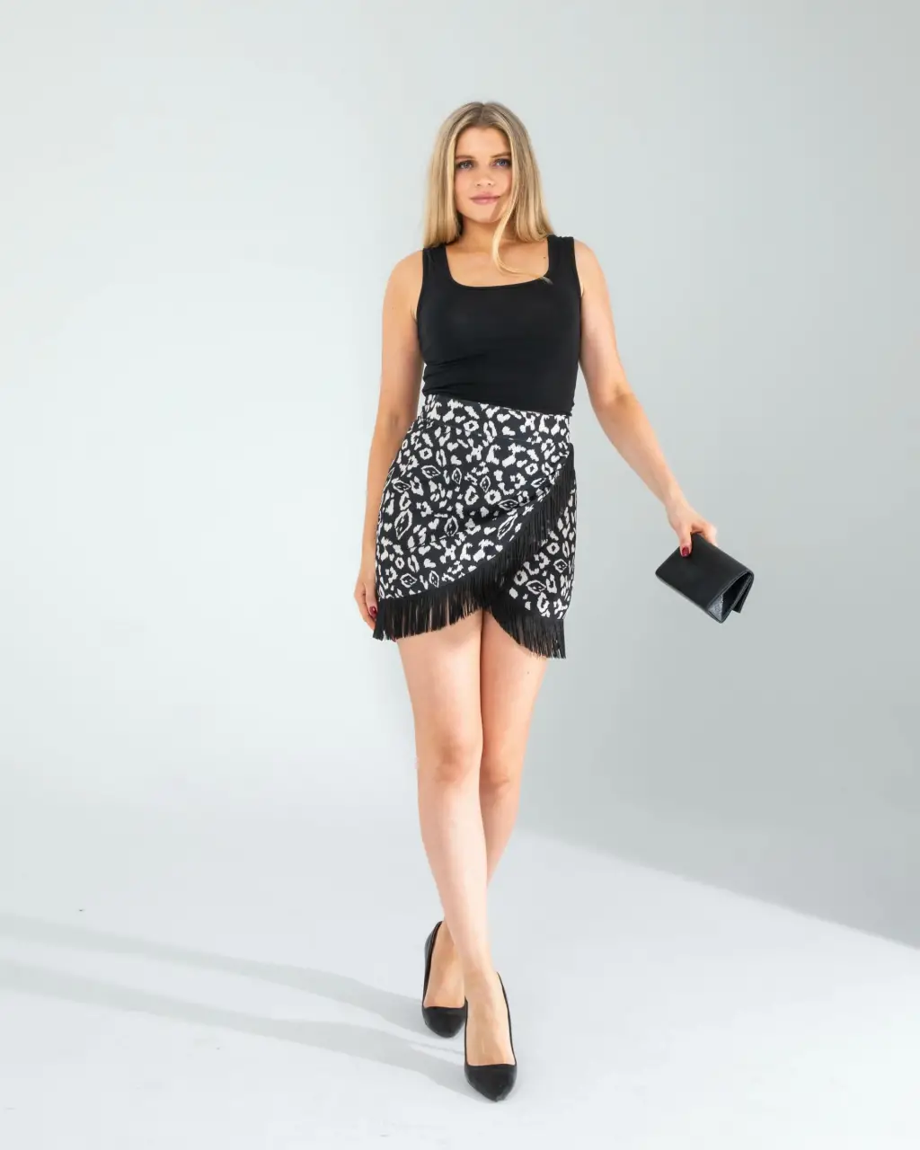 Tarzınızı yenileyin! Bu şık ve modern mini etek, yüksek kaliteli kumaşı ve özenle işlenmiş püskül detayları ile dikkat çekiyor. Siyah ekru desenleri, her mevsim ve her ortamda rahatlıkla kullanabileceğiniz bir parça olmasını sağlıyor. Mini boyu sayesinde hem günlük hem de özel günlerde rahatlıkla tercih edebilirsiniz. Esnek bel yapısı ve konforlu kesimi ile gün boyu rahatlık sunar. Dolabınızın vazgeçilmez parçası olacak bu etek, şık ve zarif bir görünüm için ideal.