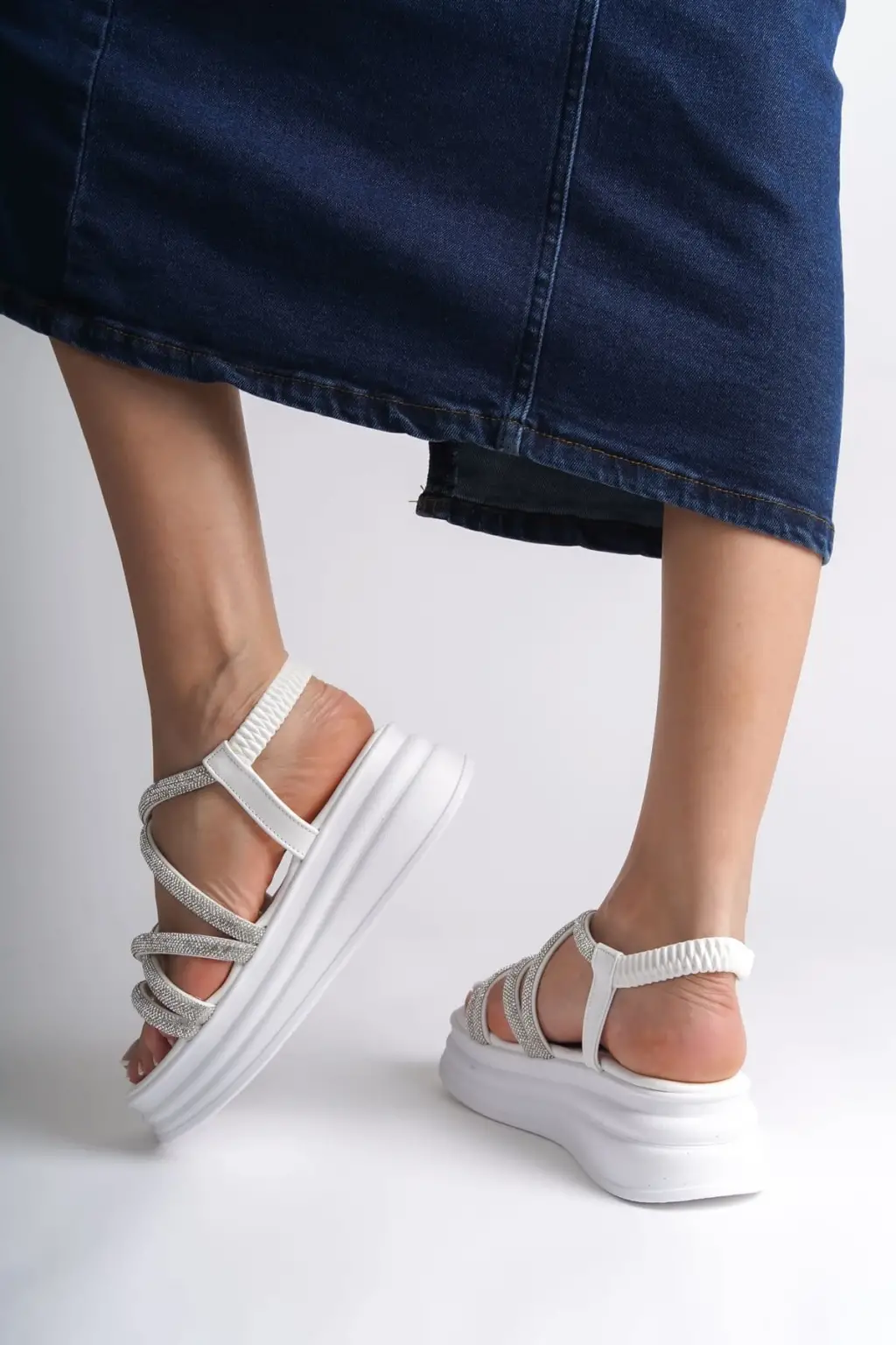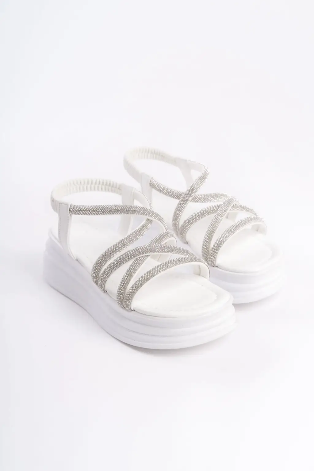 ELENA Lastikli Taşlı Şeritli Rahat tabanlı ayakkabı Tabaan Bayan Sandalet CBT - Beyaz