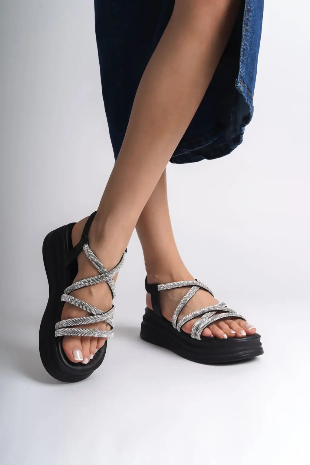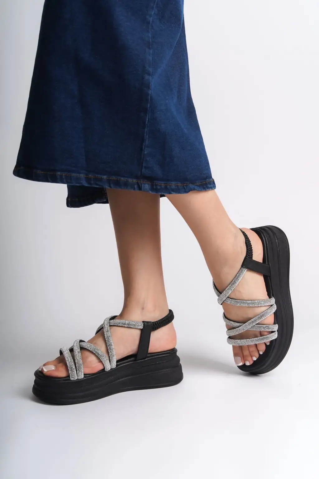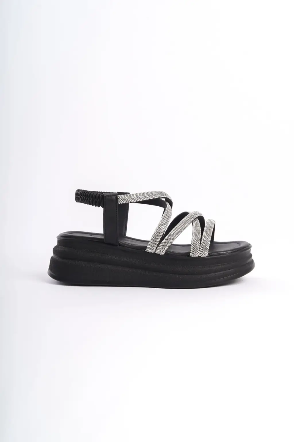 ELENA Lastikli Taşlı Şeritli Rahat tabanlı ayakkabı Tabaan Bayan Sandalet CGünlük Şık - Siyah