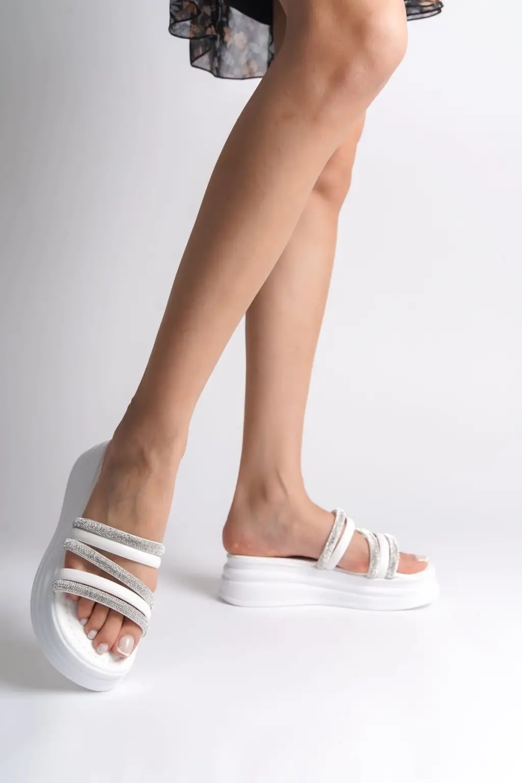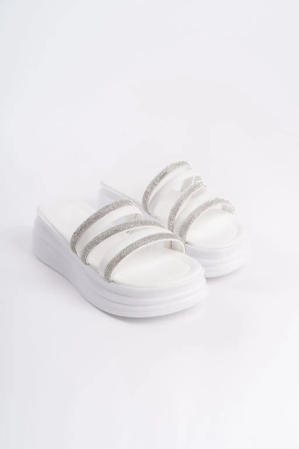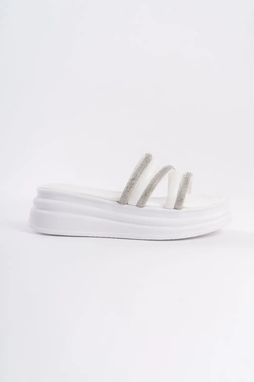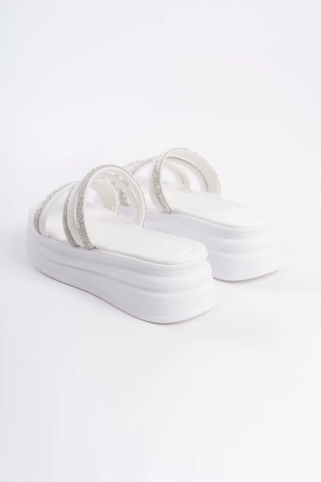 ELISE Düz Topuklu Şeritli Taşlı Kalın ve Rahat tabanlı ayakkabı Tabaan Bayan Terlik CBT - Beyaz