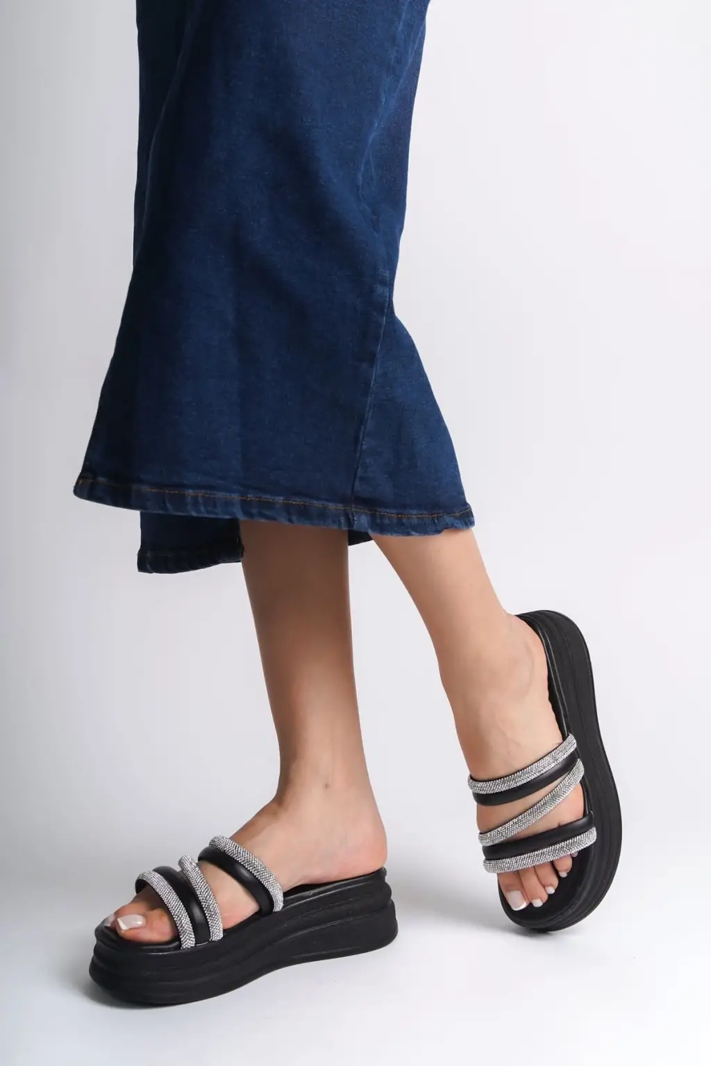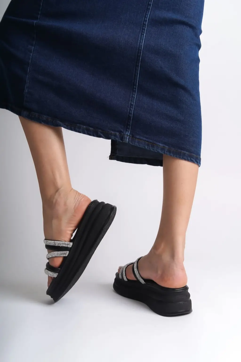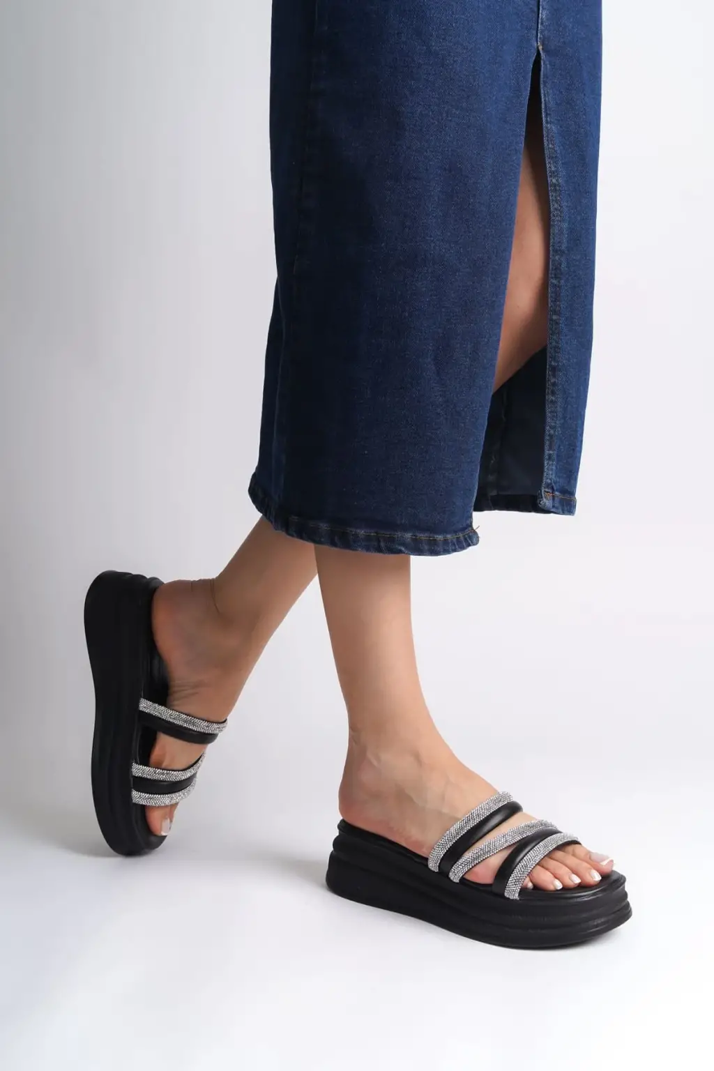 ELISE Düz Topuklu Şeritli Taşlı Kalın ve Rahat tabanlı ayakkabı Tabaan Bayan Terlik CGünlük Şık - Siyah