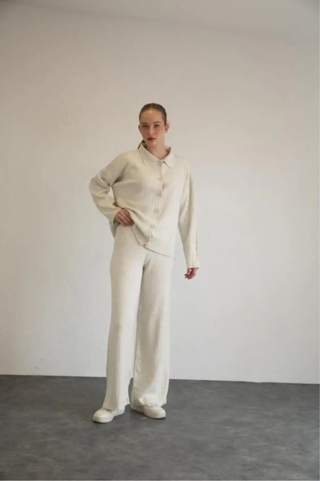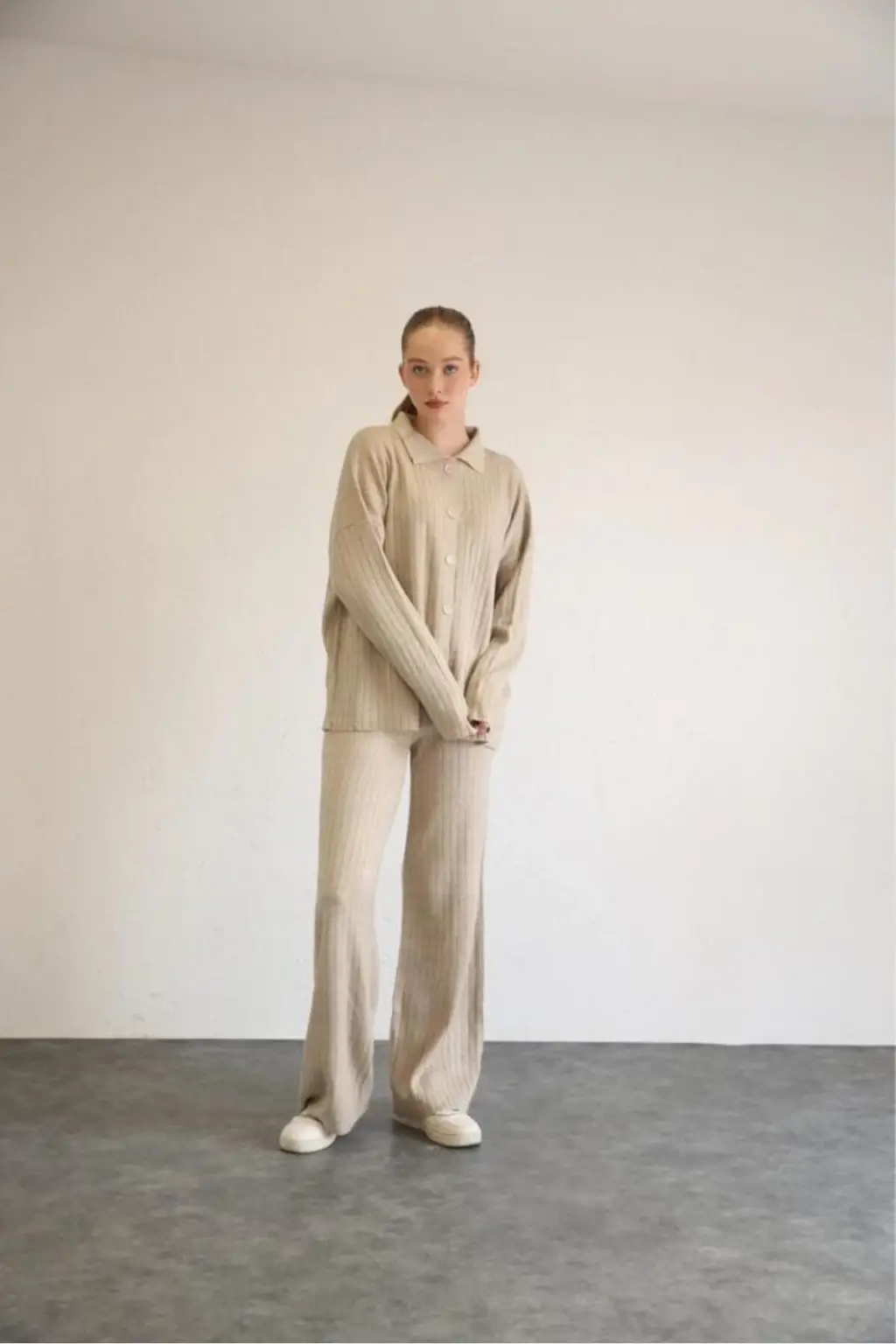 Şıklığı ve rahatlığı bir arada sunan mükemmel bir seçenektir. Fitilli dokusu ve düğme detayları ile modern bir görünüm kazandırırken, palazzo pantolon kesimi ile hareket özgürlüğü sağlar. Triko kumaşı sayesinde hem sıcak tutar hem de nefes alabilir. Bu takım, günlük kullanımda veya özel günlerde rahatlıkla tercih edilebilir. Minimalist tasarımı ile her tarza uyum sağlar ve gardırobunuzun vazgeçilmez parçalarından biri olur.