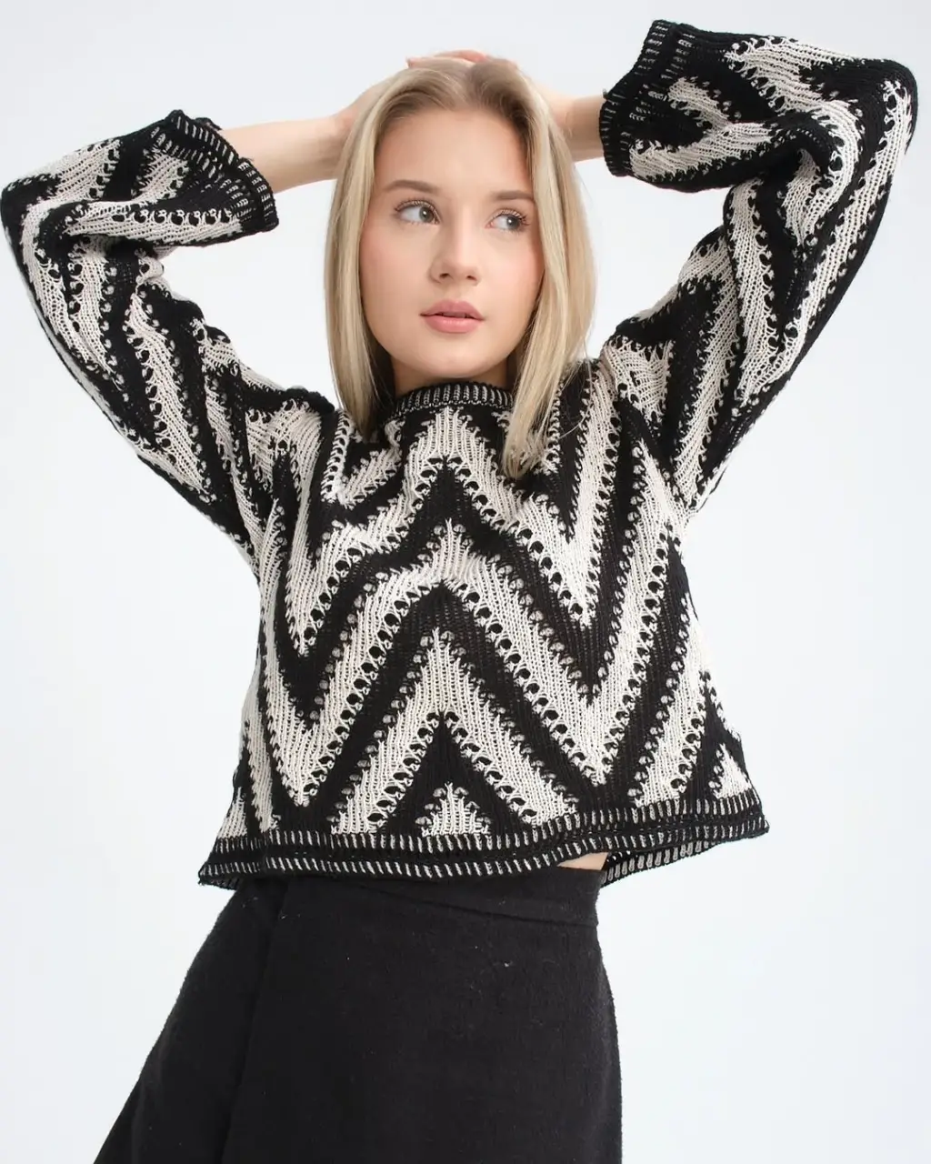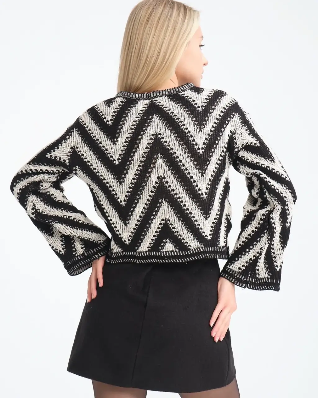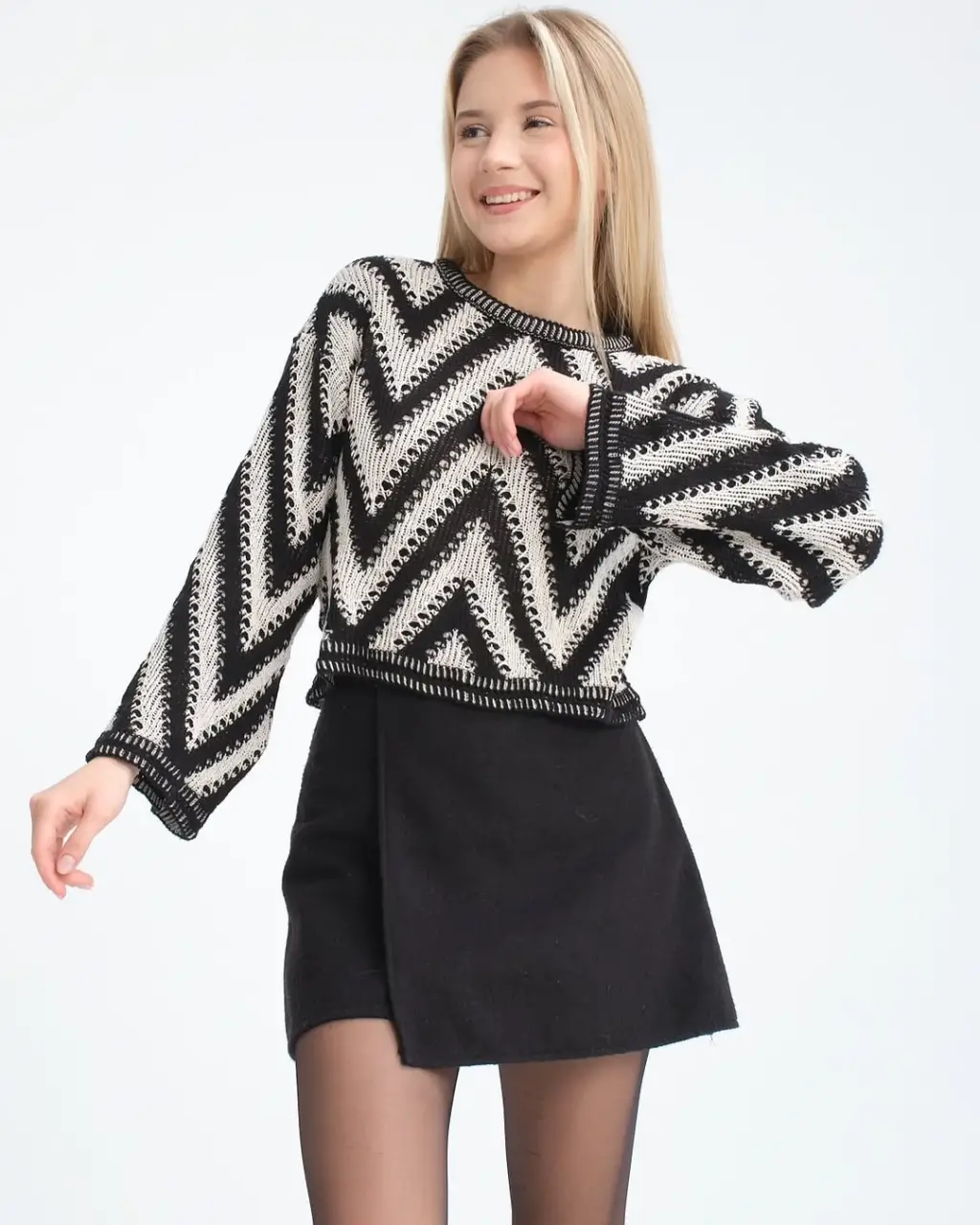 Gece Şıklığı: Geometrik desenli kazağınızı deri bir mini etek ve yüksek topuklu botlar ile kombinleyin. Üzerine siyah bir deri ceket ekleyerek asi ve çarpıcı bir tarz yaratabilirsiniz.