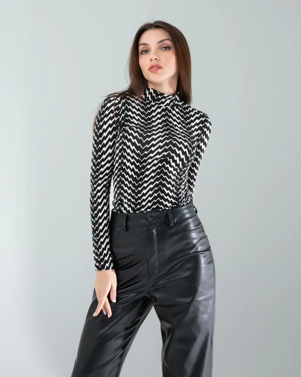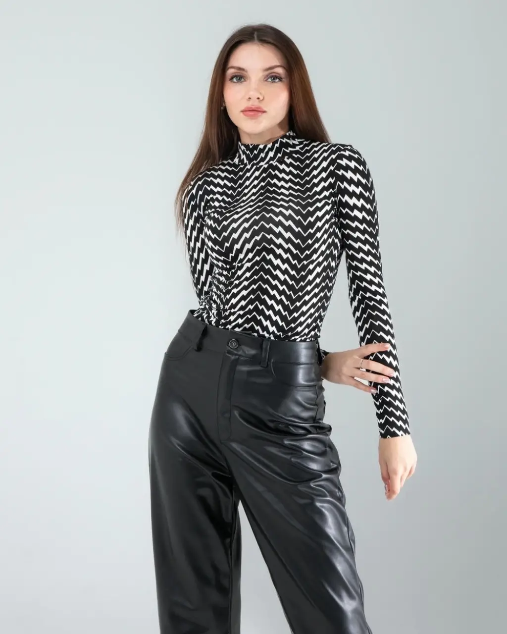 Günlük Şıklık: Siyah beyaz geometrik desenli body’yi, yüksek bel siyah skinny jean ve beyaz spor ayakkabılarla kombinleyin. Üzerine siyah deri ceket ekleyerek tamamlayabilirsiniz.