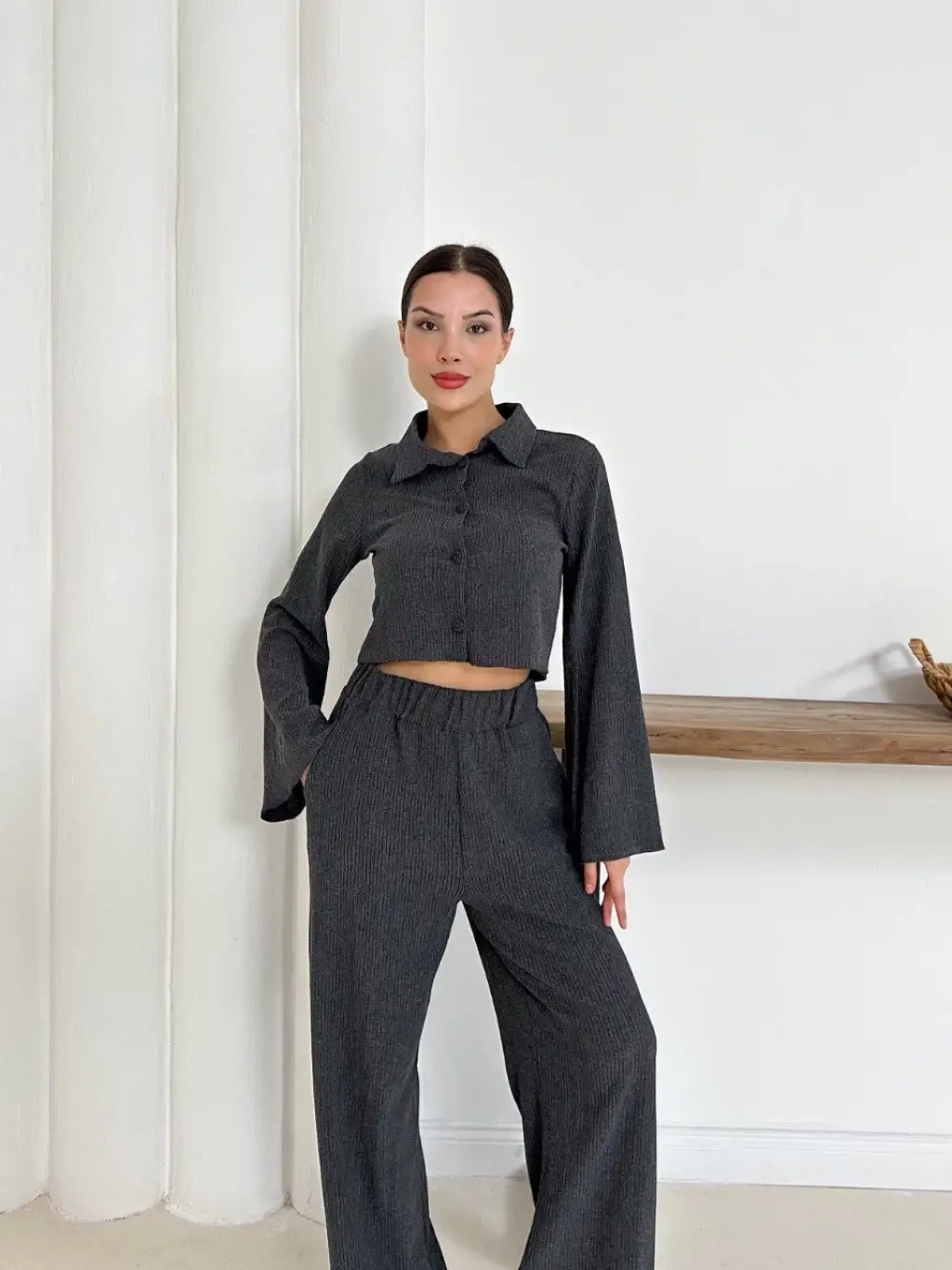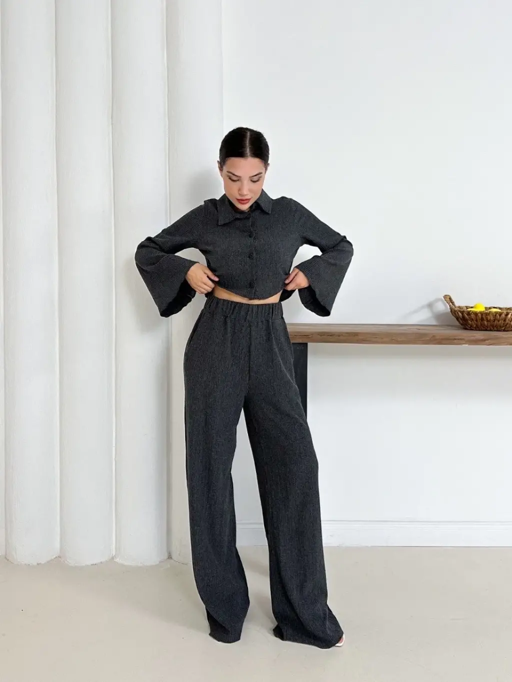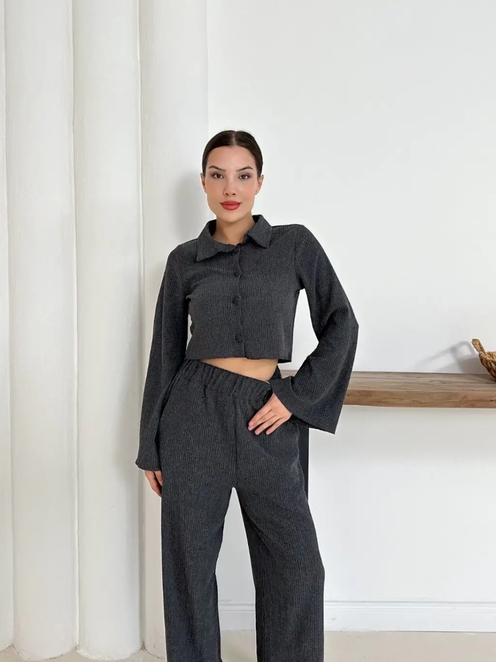 Şıklığı ve zarafeti bir arada sunan Gömlek Yaka Kaplama Düğmeli Takım Antrasit ST265866 ile öne çıkın.