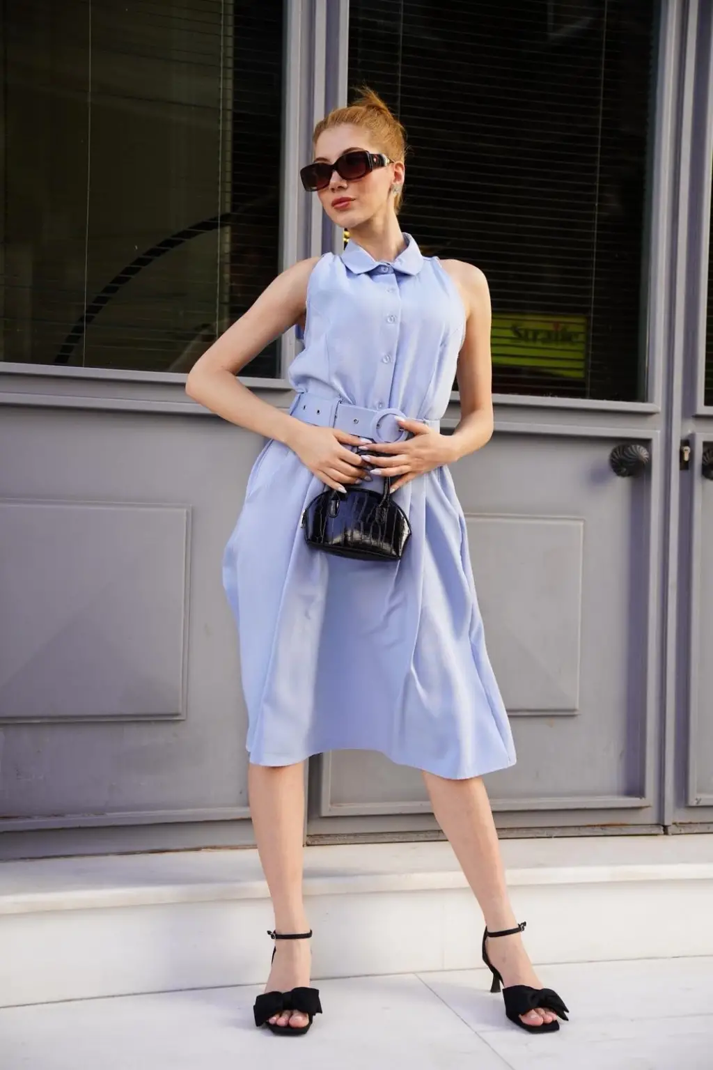 Gömlek yaka kemerli elbise mavi s255061