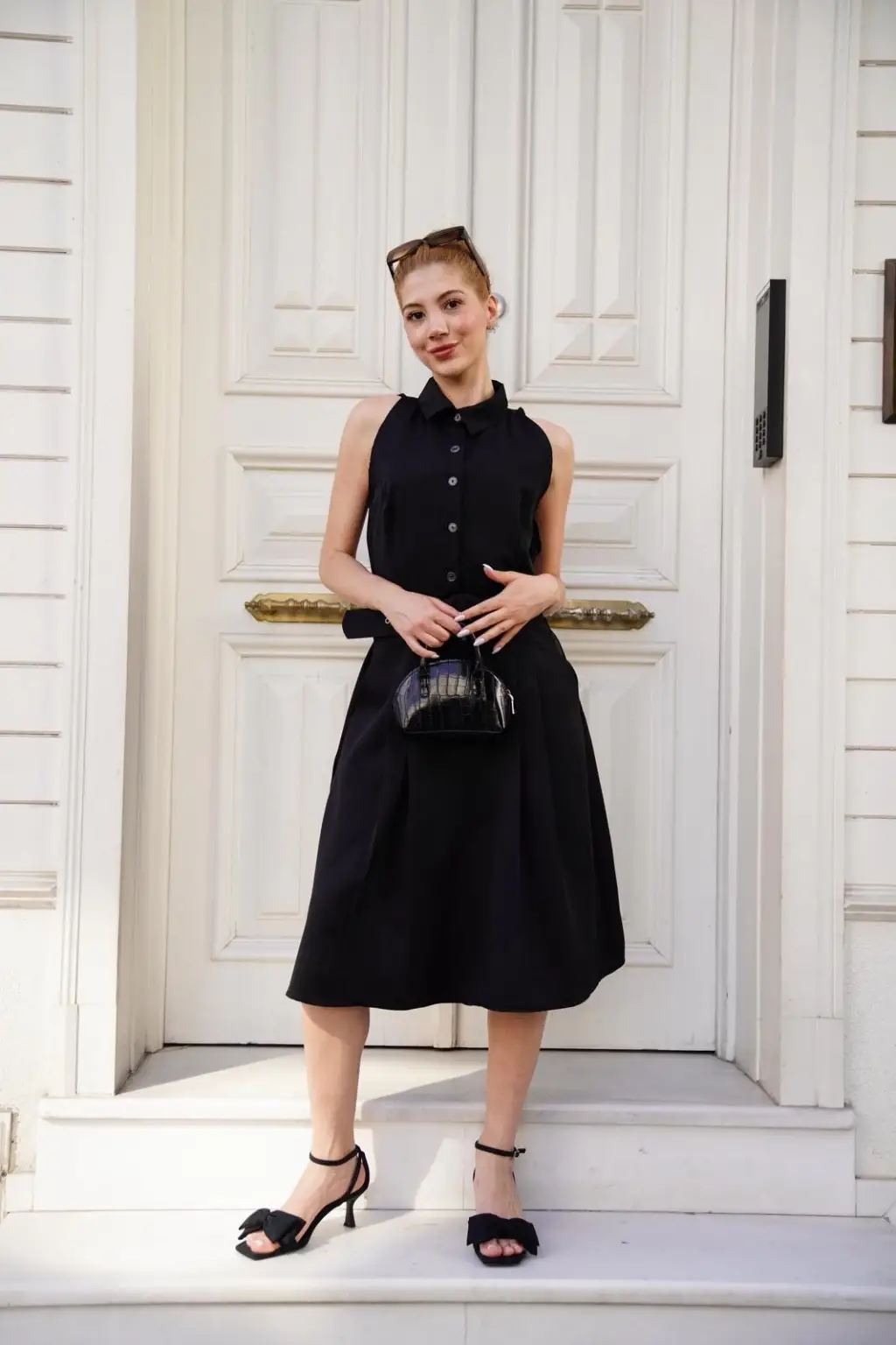 Gömlek yaka kemerli siyah elbise, gardırobunuzun vazgeçilmez parçası olmaya aday! Zarif tasarımıyla dikkat çeken bu elbise, şıklığı ve rahatlığı bir arada sunuyor. %100 pamuklu kumaşı sayesinde gün boyu konforu garantilerken, belindeki kemer detayıyla da feminen bir görünüm sağlıyor. Hem günlük hayatta hem de özel davetlerde rahatlıkla tercih edebileceğiniz bu elbise, şıklık konusunda sizi yalnız bırakmayacak.