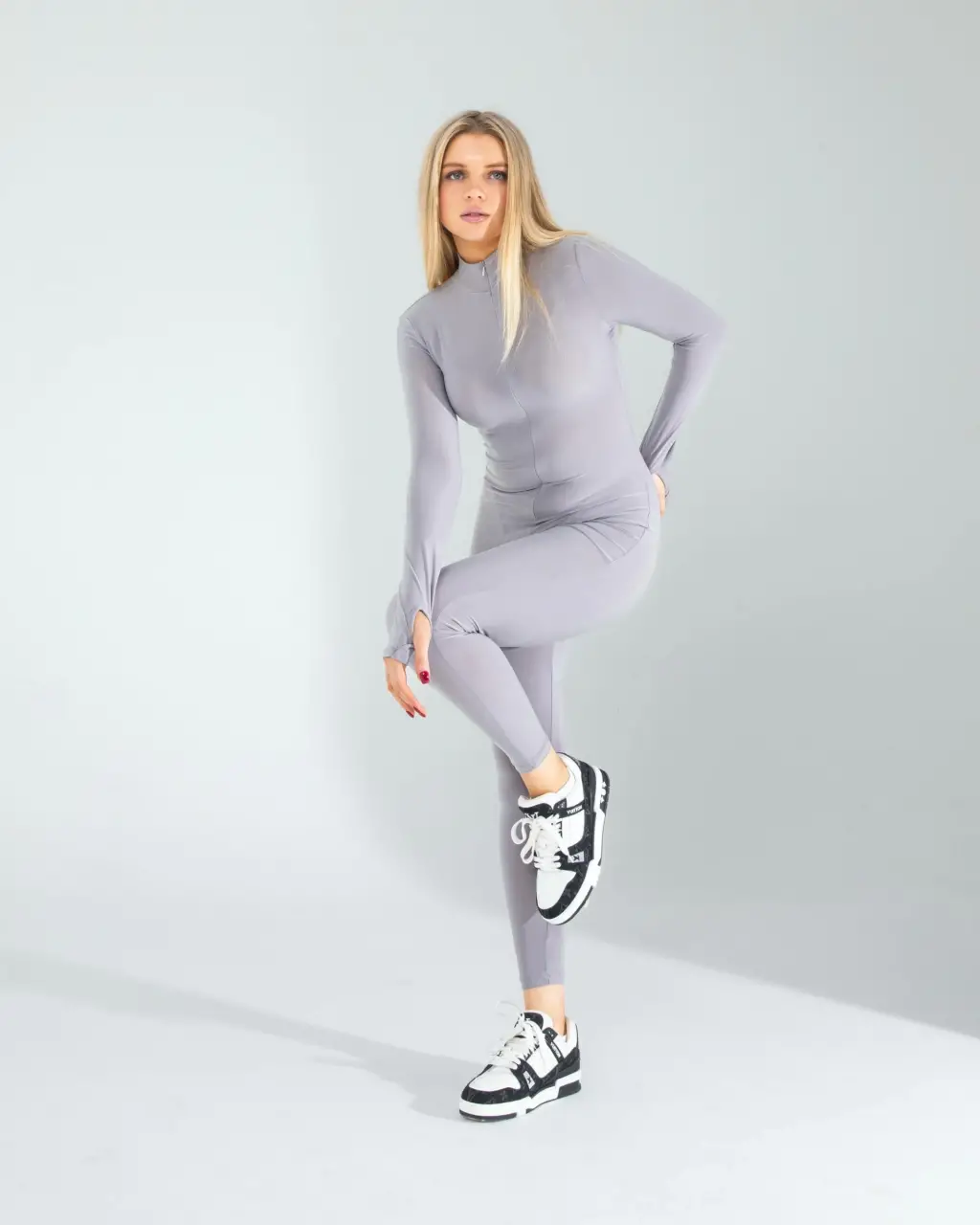 Günlük Rahatlık: Gri antrasit tulum taytınızı oversize beyaz bir tişört ve siyah sneakerlarla kombinleyin. Sade bir sırt çantası ile görünümünüzü tamamlayın.