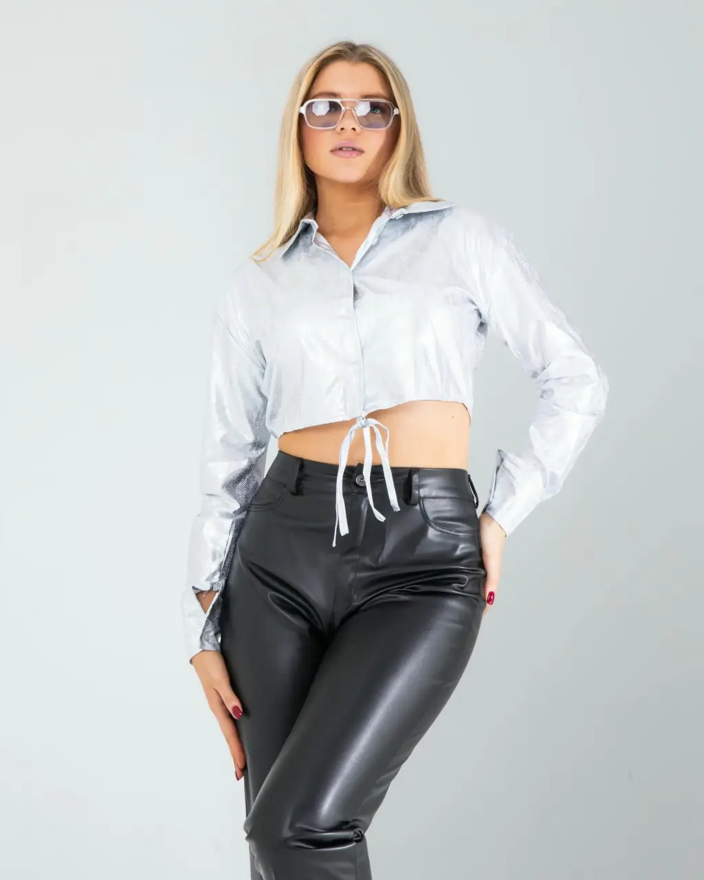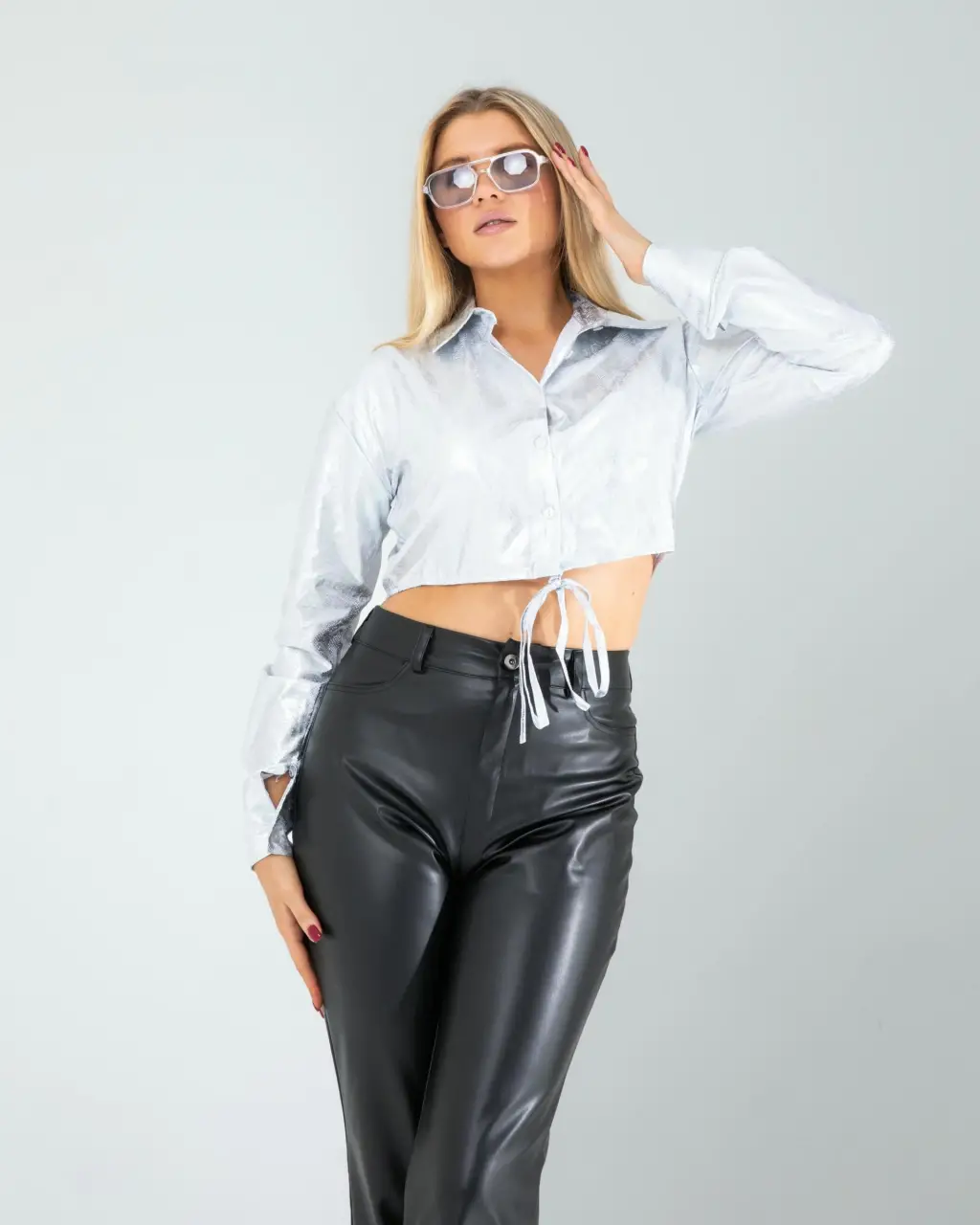 - Gömlek + Siyah deri pantolon + Metalik topuklu ayakkabılar + Gösterişli küpeler