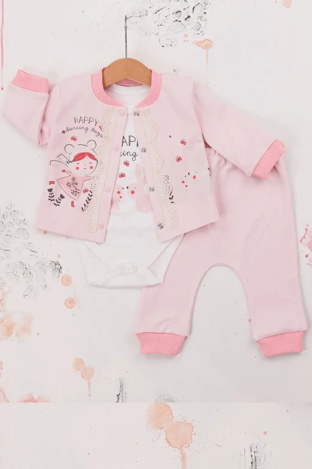 Happy Dancing Desenli 3'lü Hırkalı Kız Bebek Takım
