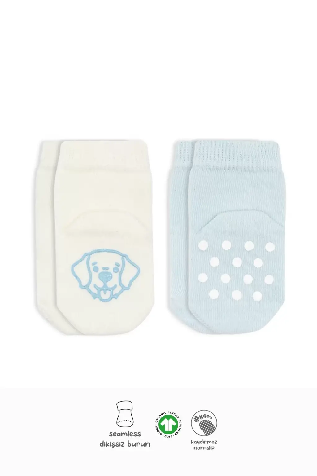Hayvan Figürlü Kaymaz Soket Çorap 2'li Mavi Ekru