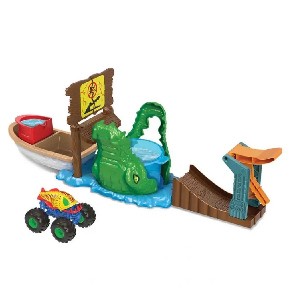b® Monster Trucks Swamp Chomp™ Color Shifters™ Playset ile parçalama ve çarpma, büyük heyecan ve heyecan için bir renk değişimi sürprizleri dalgası sunuyor!