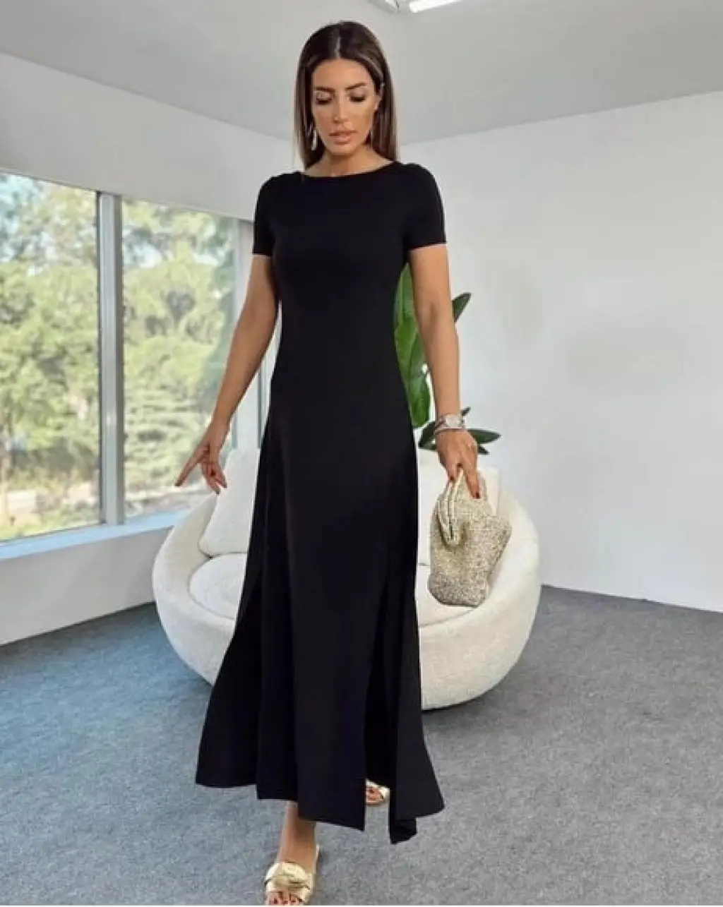 Kadın Kısa Kollu Sırt Dekolte Detay önü çift Yırtmaçlı Viskon Elbise