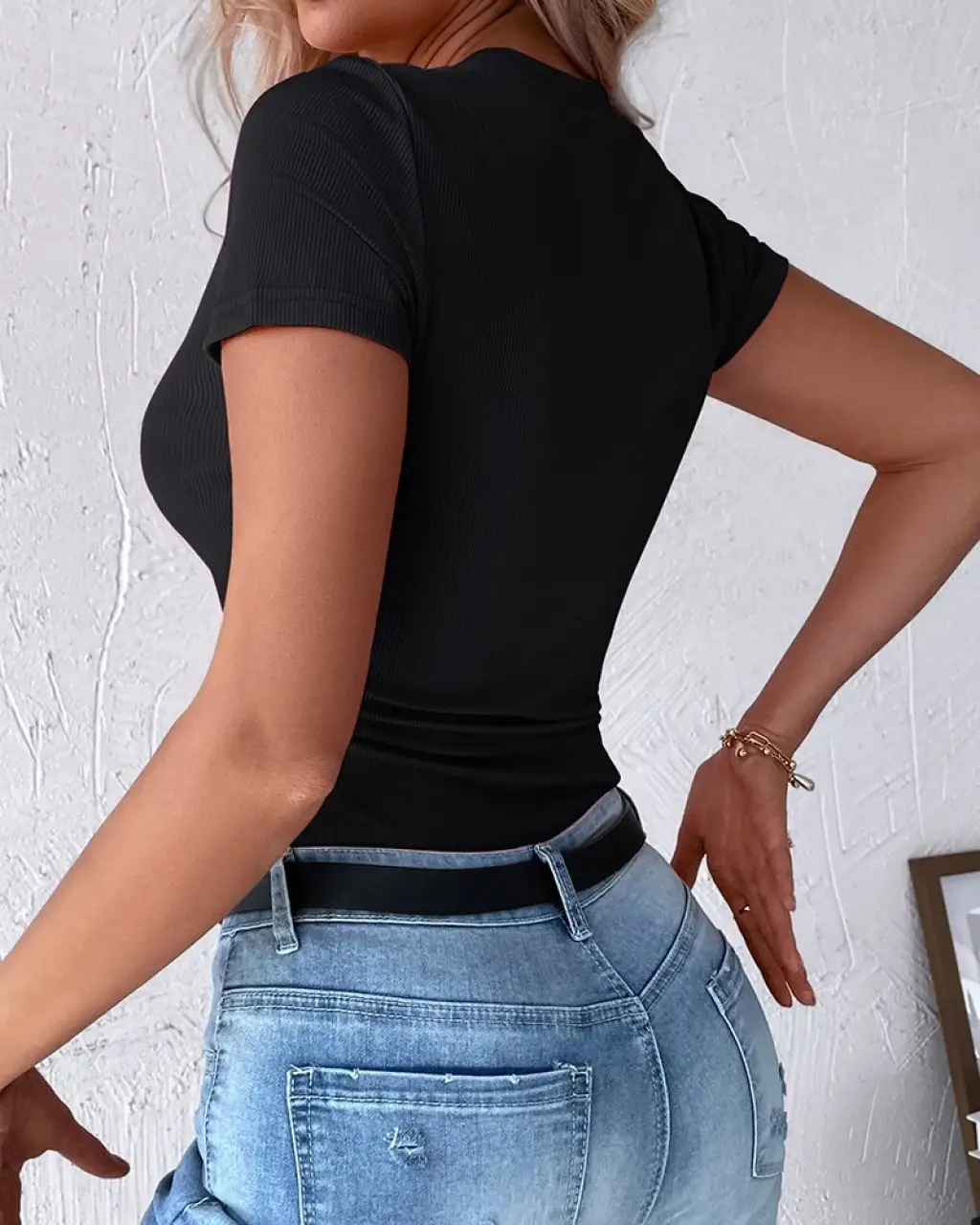 Kadın Kısa Kollu Yuvarlak Yakalı Düğme Detay Kaşkorse Bluz