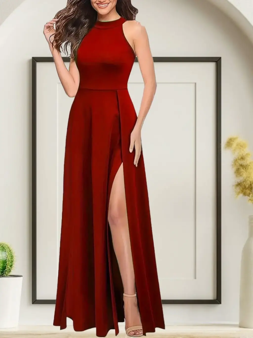 Kadınhalter Yaka Derin Yırtmaç Detaylı Tam Boy Ithal Krep Abiye Elbise