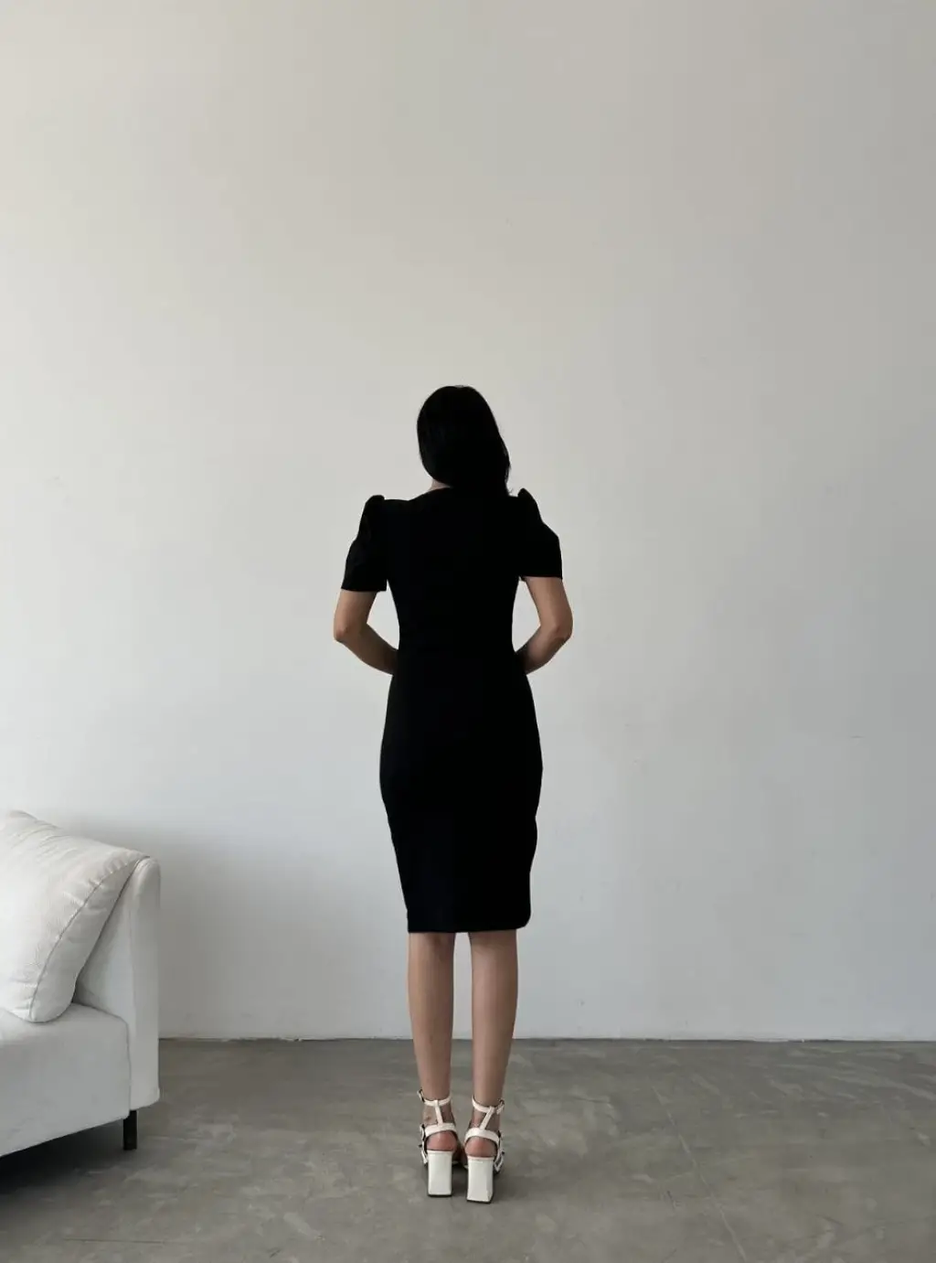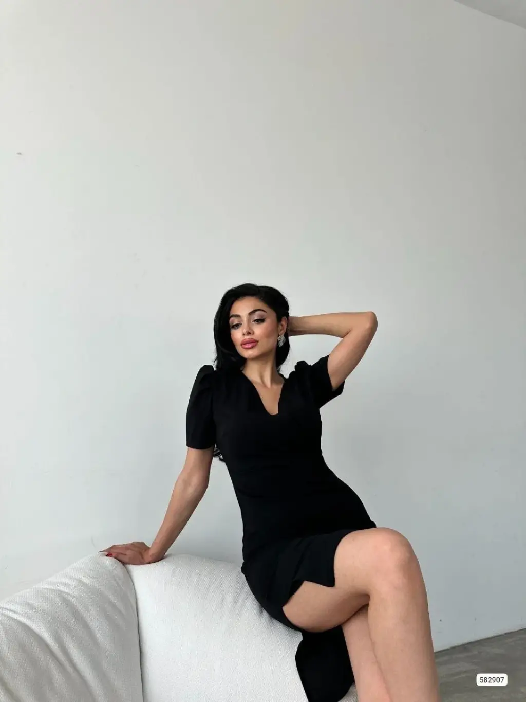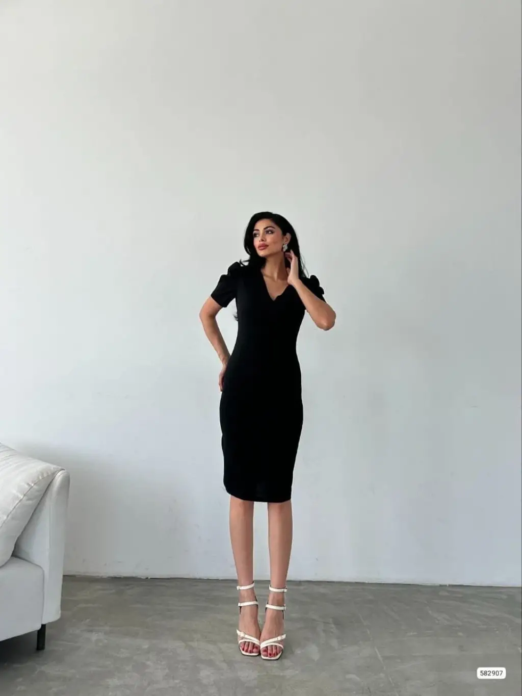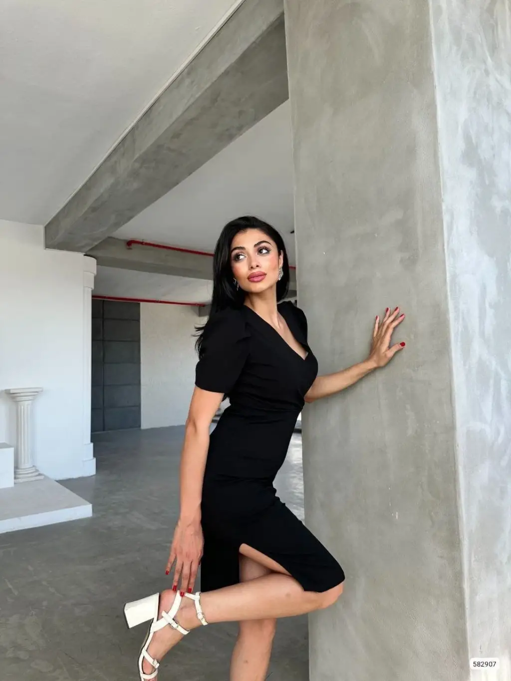 Omarı Derin Dekolte V Yakalı Yırtmaçlı Kadın Midi Elbise