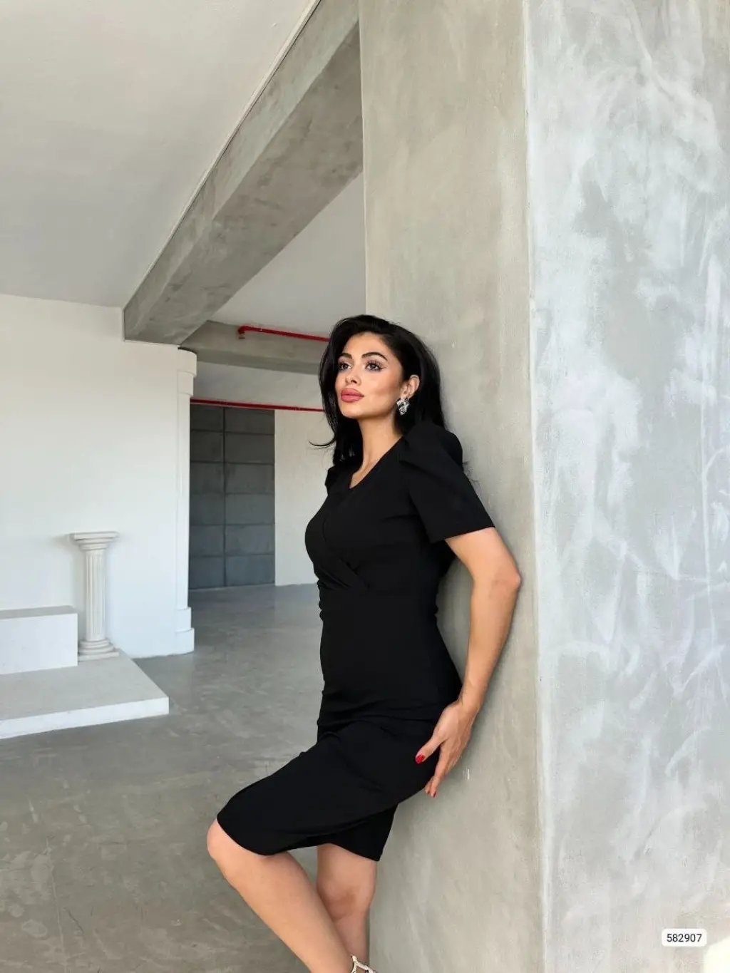 Kadın Kruvaze Yaka Yandan Yırtmaç Detaylı Scuba Krep Kumaş Midi Boy Elbise