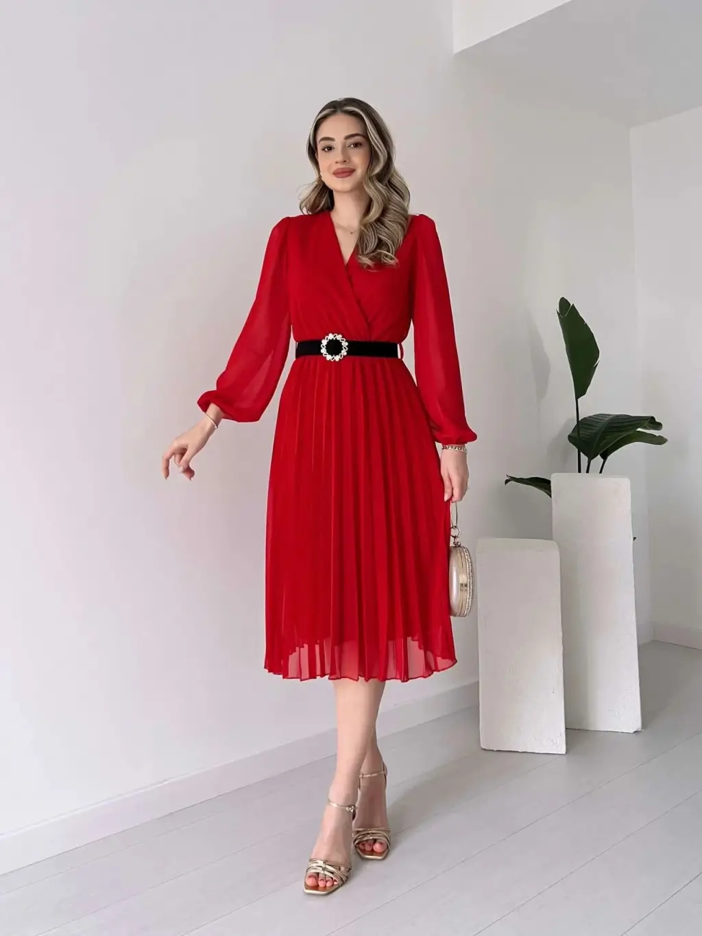 Kadın şifon Kumaş Astalı Kloş Kesim Kruvaze Yaka Midi Boy Elbise