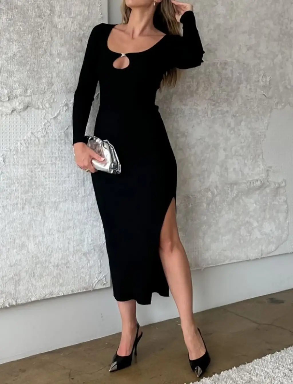 Kadın Uzun Kollu Göğüs Ve Göbek Dekolte Detay Sandy Midi Boy Elbise