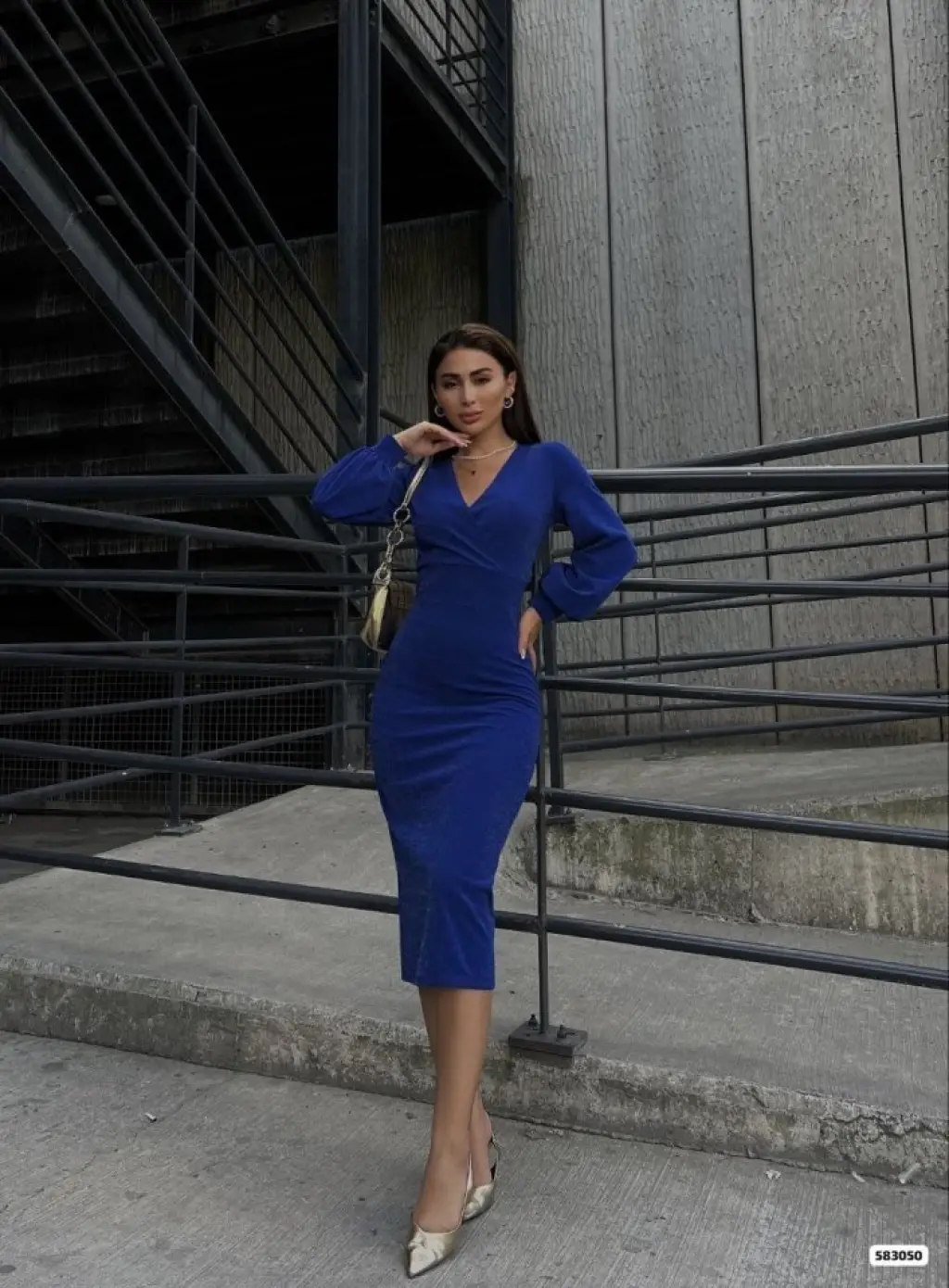 Kadın Kruvaze Yaka Balon Kol Simli Krep Kumaş Midi Boy Elbise