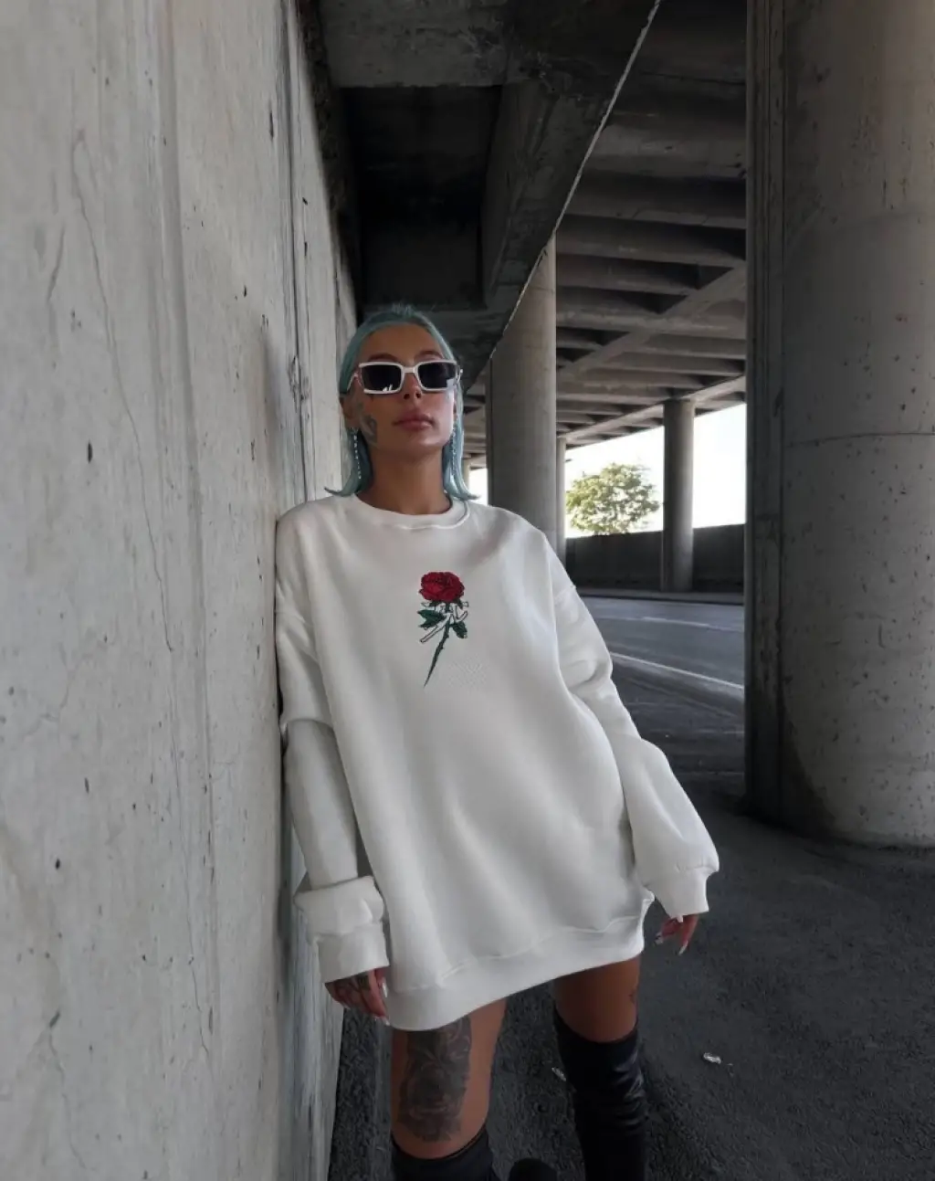 Kışlık Bisiklet Yaka Oversize Baskılı SweatShirt - Beyaz