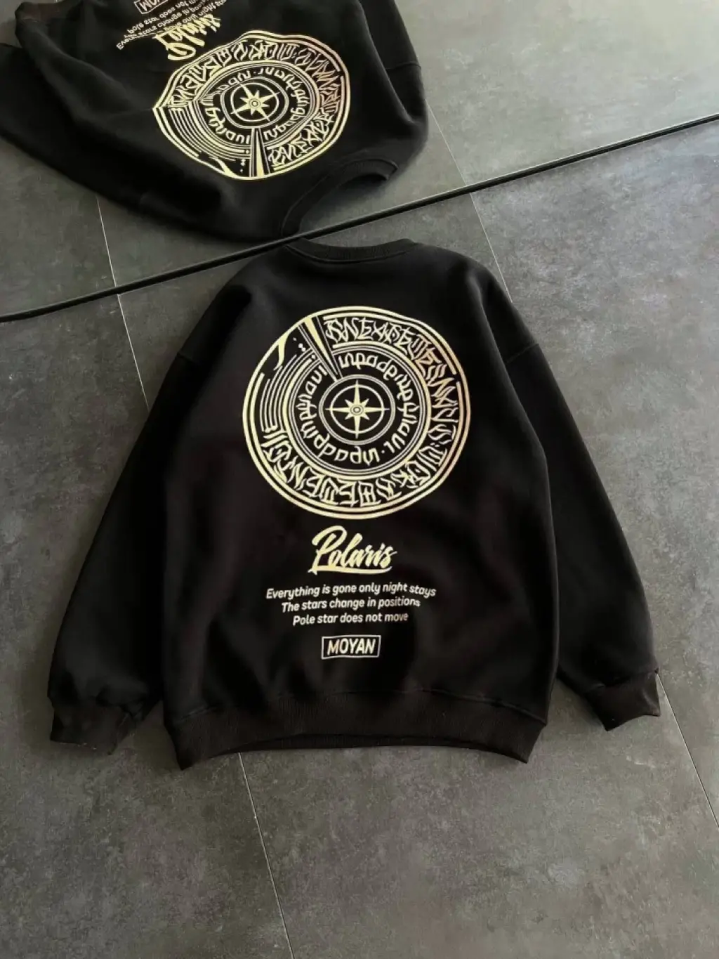Kışlık Bisiklet Yaka Ön Ve Arka Baskılı SweatShirt - Siyah