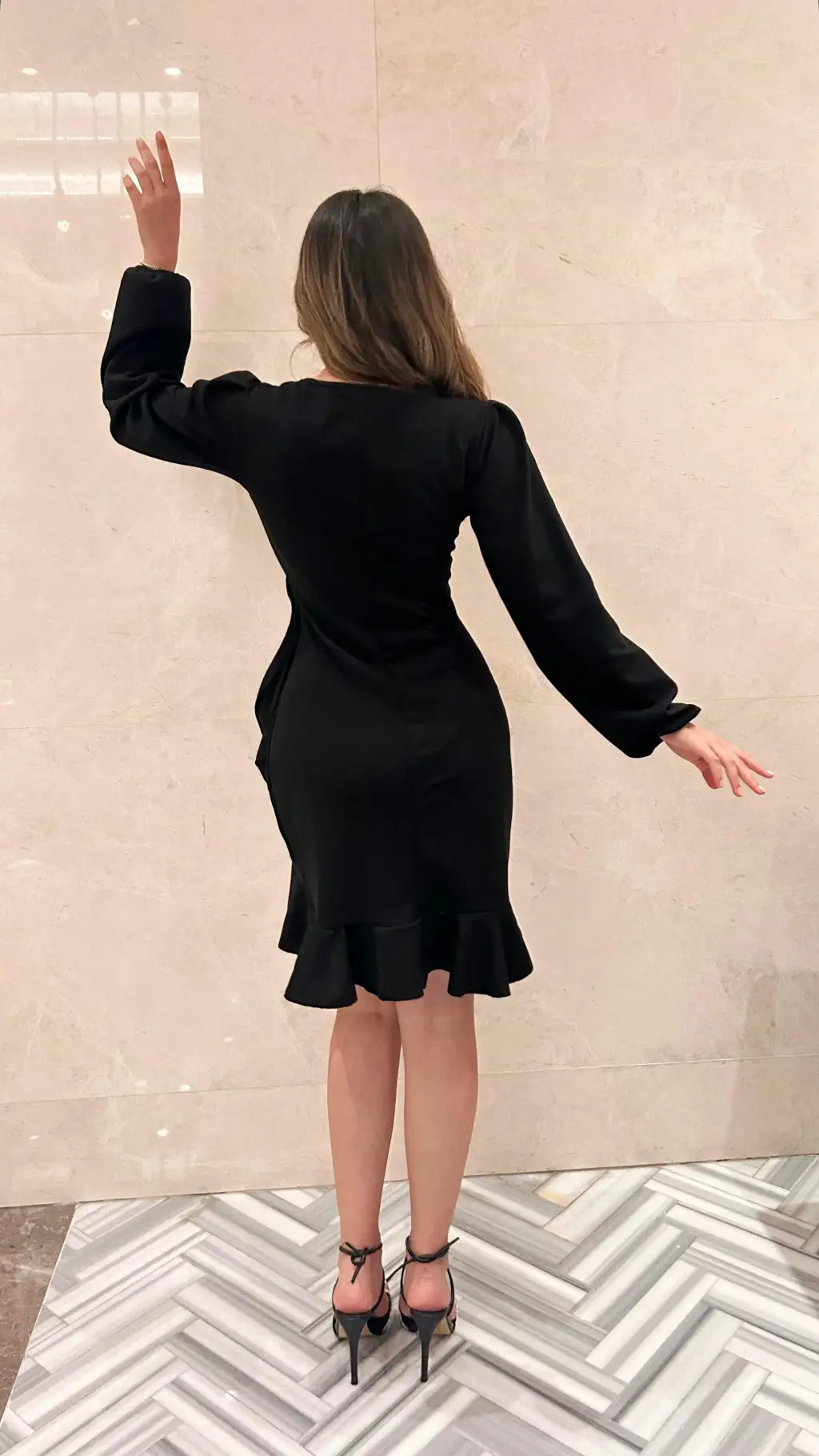 Kadın Uzun Kollu Kruvaze Yaka Yandan Büzgülü Asimetrik Detaylı Ithal Krep Mini Elbise
