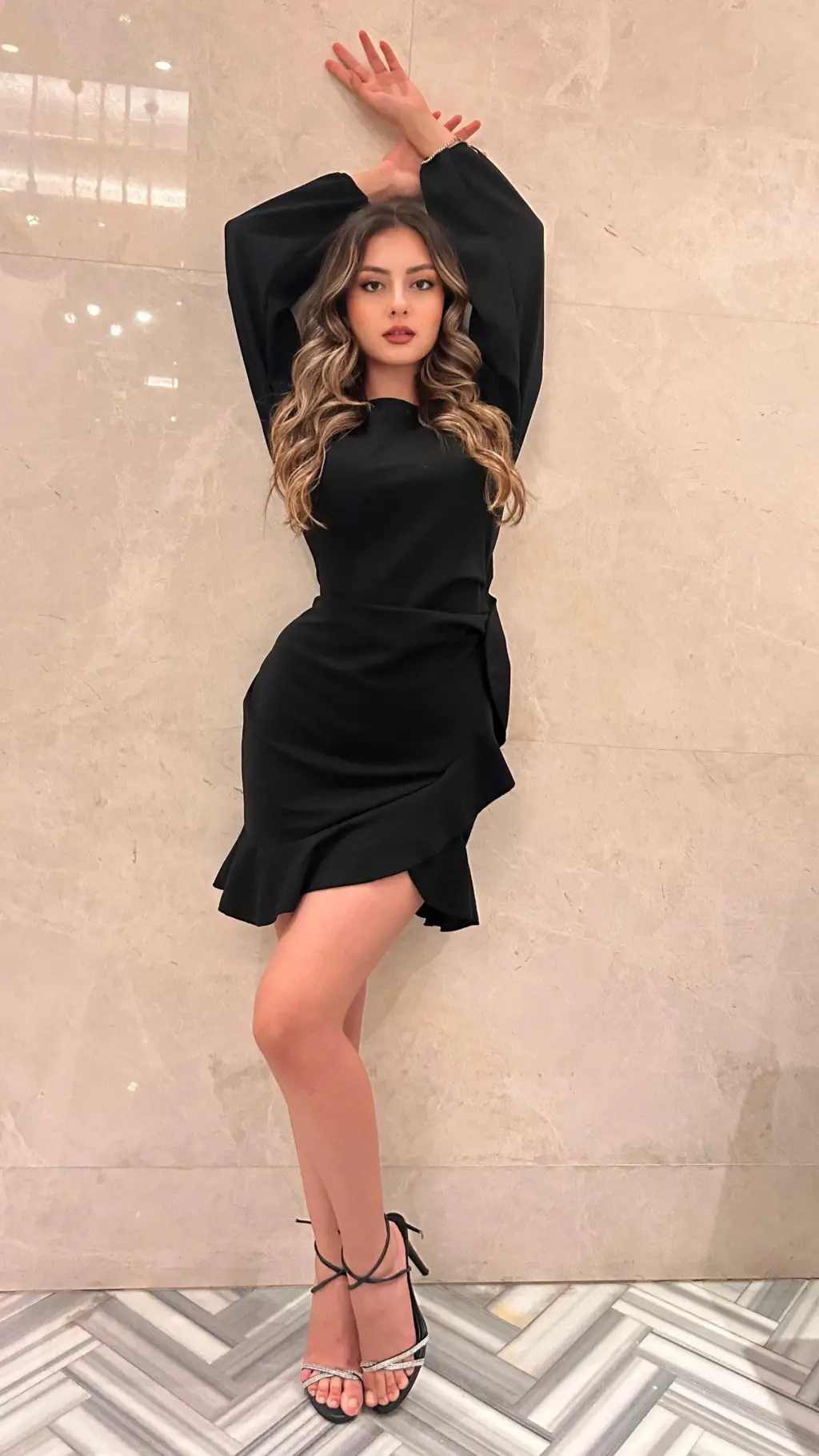 Kadın Uzun Kollu Kruvaze Yaka Kollar Tül Detay Krep Mini Boy Elbise