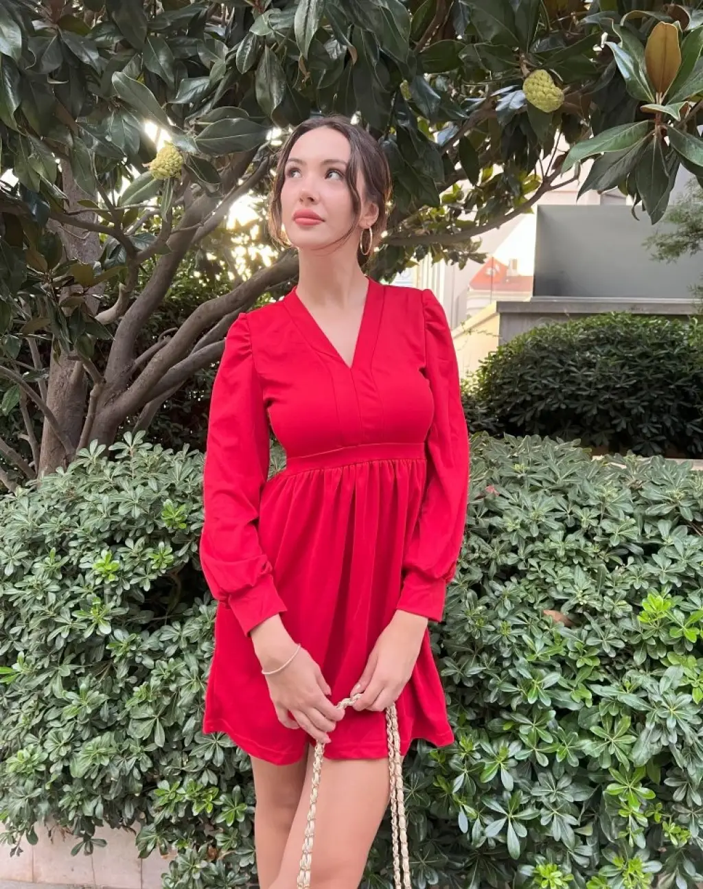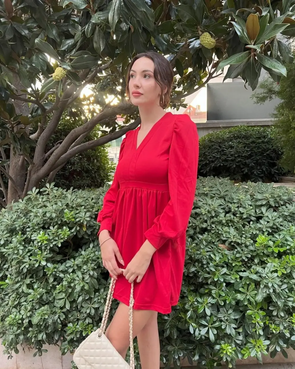 Kadın Uzun Kollu V Yaka Belden Hafif Pileli Scuba Krep Mini Boy Elbise