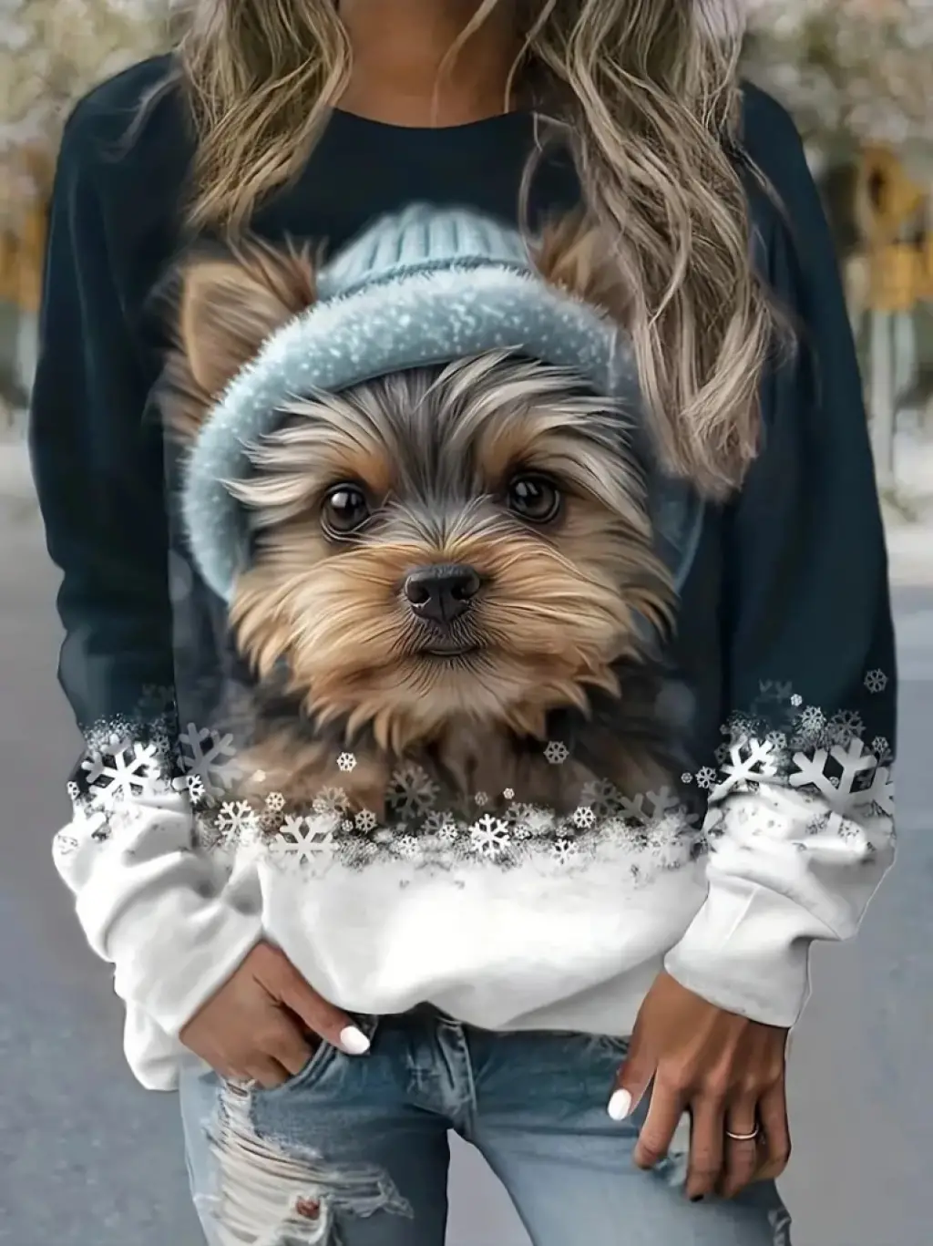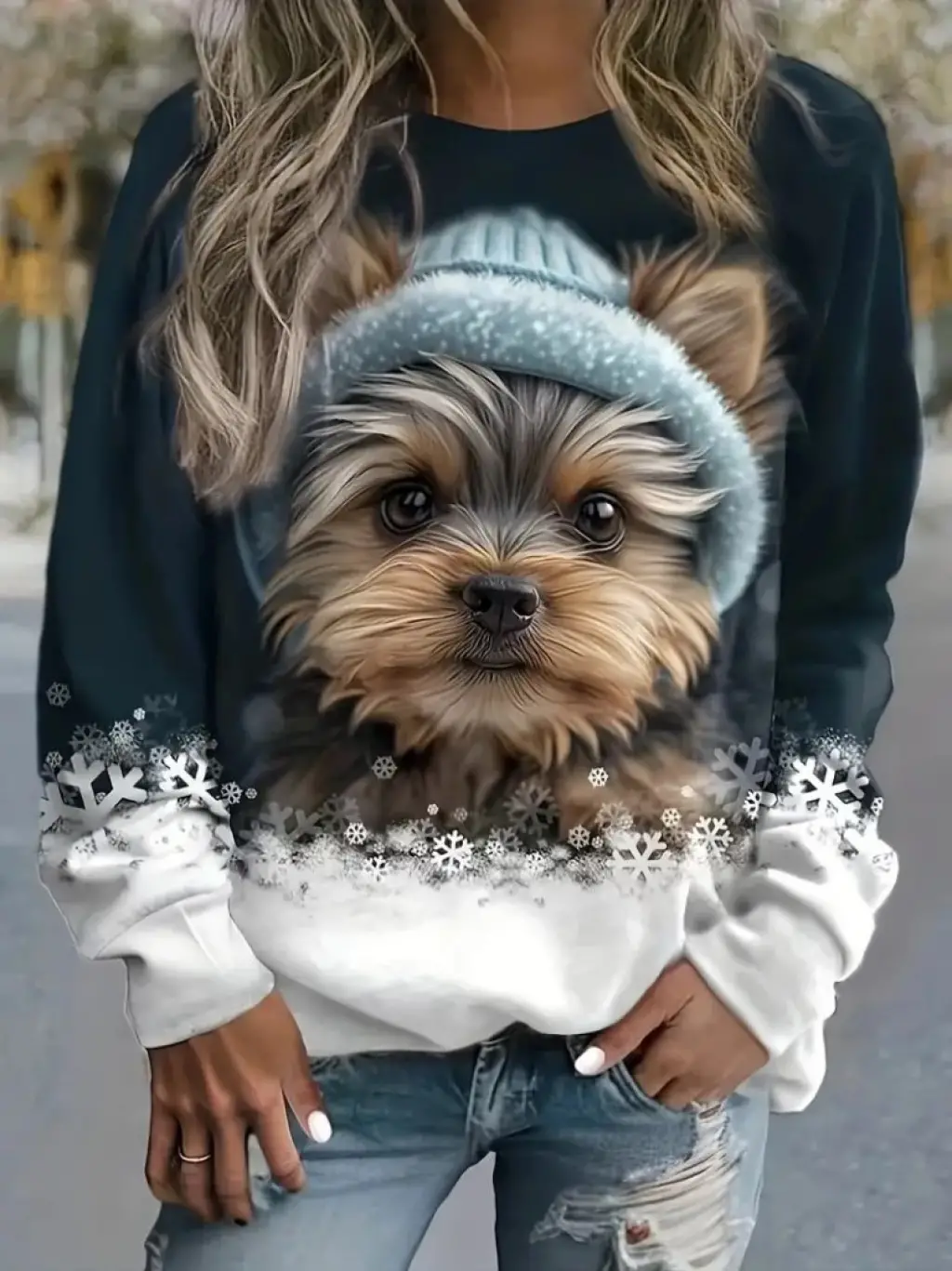 Kadın Uzun Kollu Bisiklet Yaka Köpek Baskılı şardonlu Dalgıç Bluz
