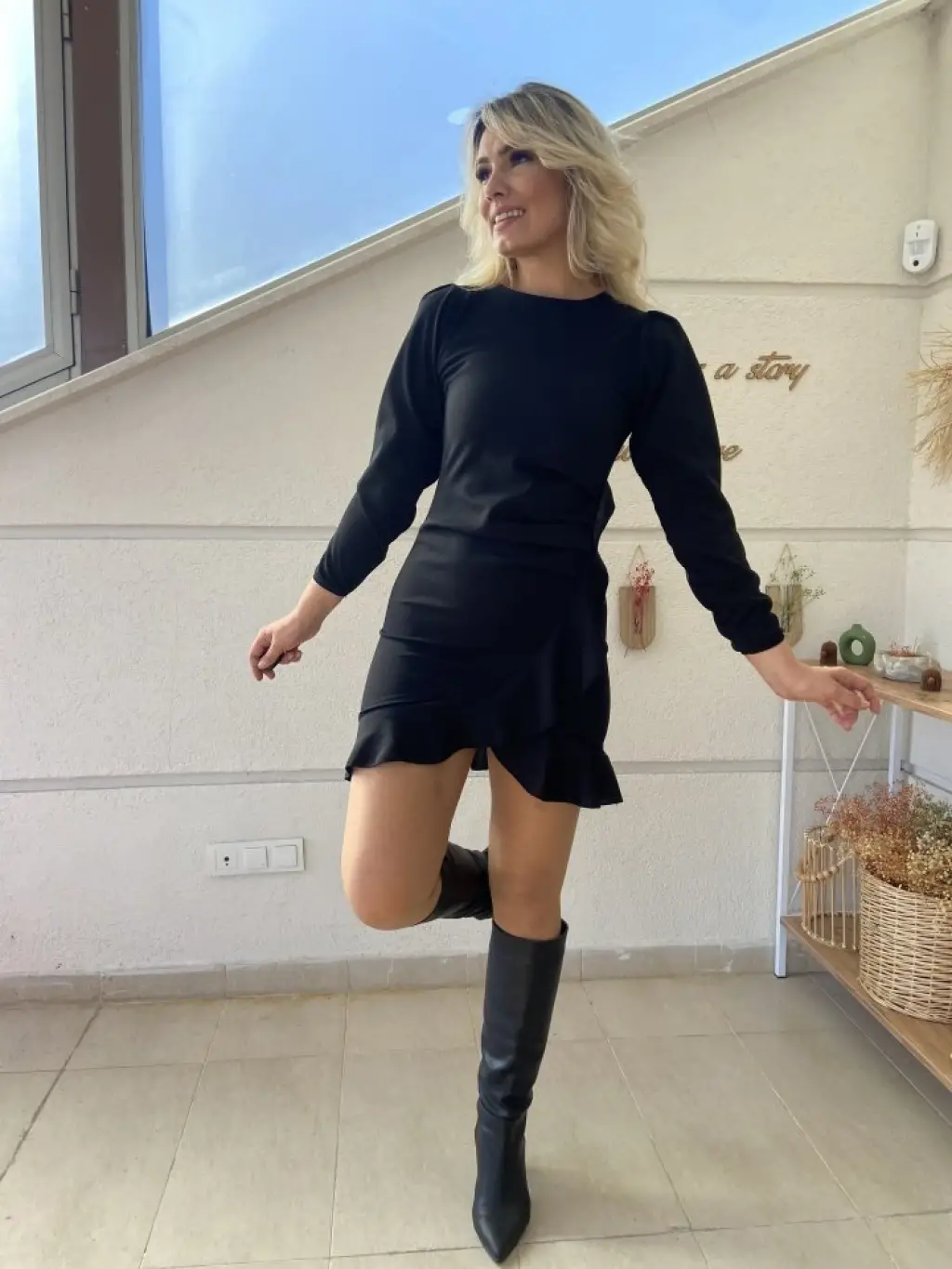 Kadın Uzun Kollu Bisiklet Yaka önden Volanlı Ithal Krep Elbise