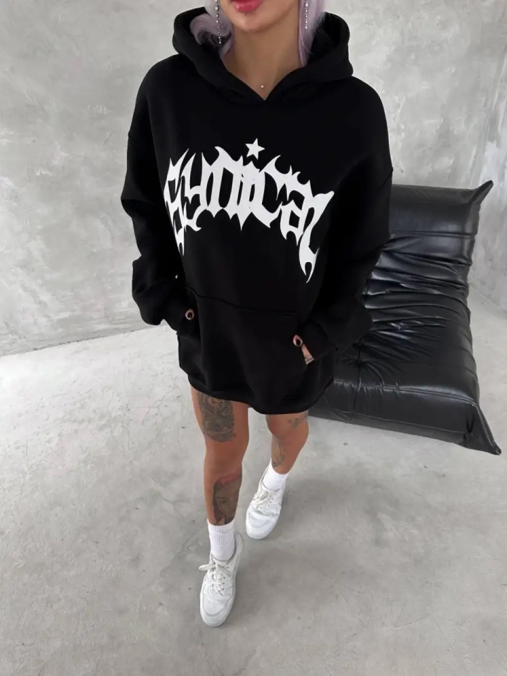 Baskılı Üç İplik Kapüşonlu Oversize Sweatshirt - Siyah
