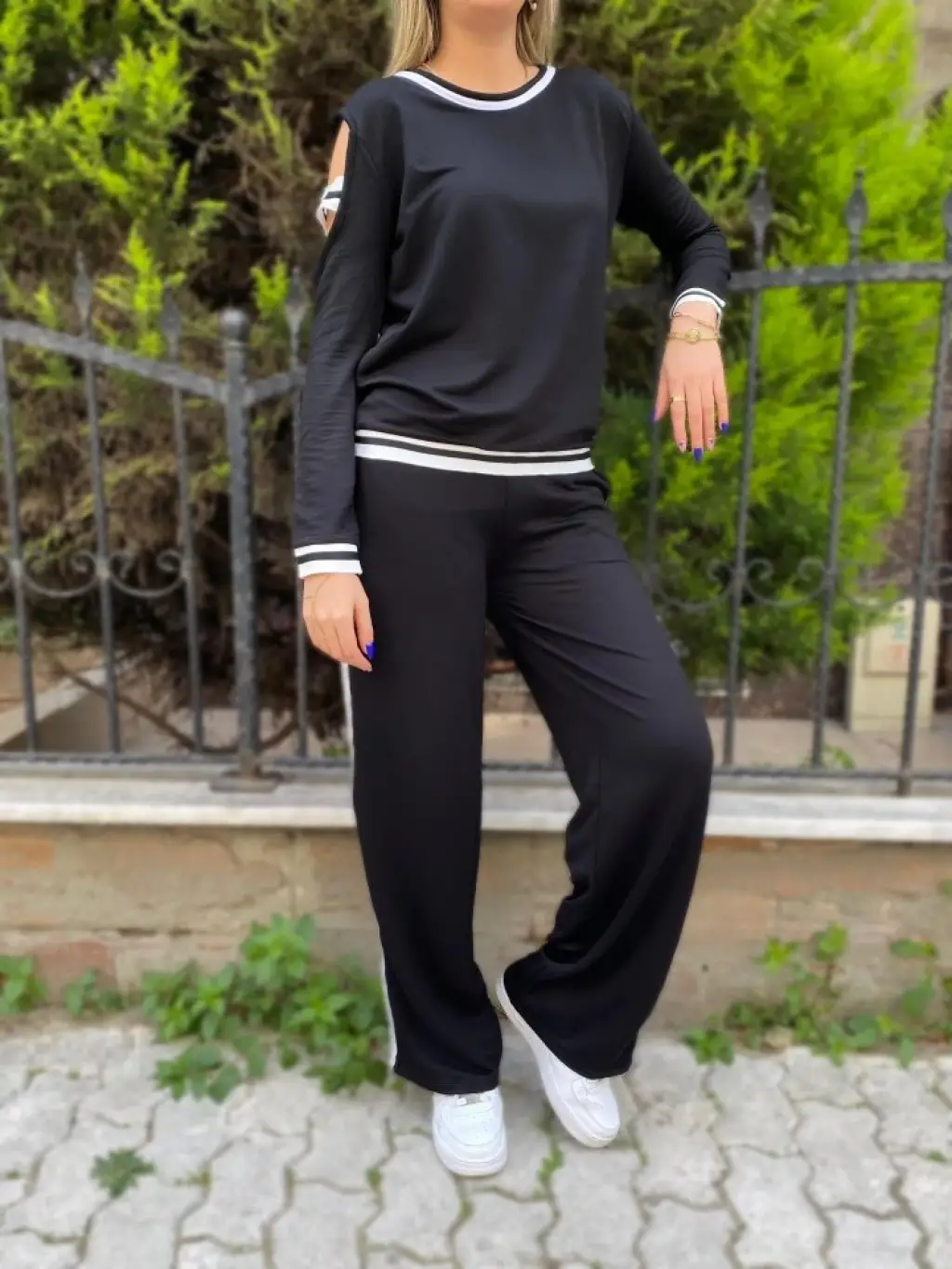 Kadın Uzun Kollu Bisiklet Yaka çift Renkli Viskon Iki Iplik Bluz Ve Pantolon Ikili Takım