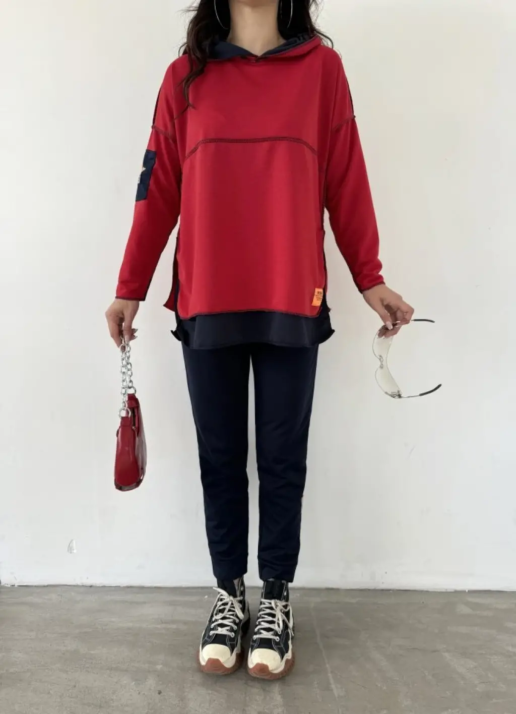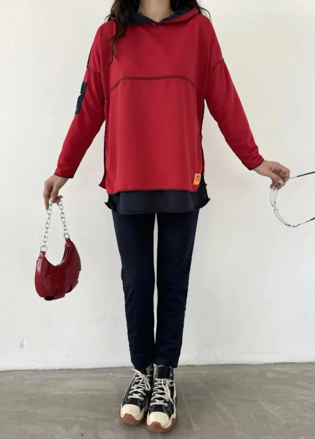 Kadın Kırmızı Kapşonlu Etek Ucu Detay Arma Ters Dikiş Gorunumlu Ikili Takım