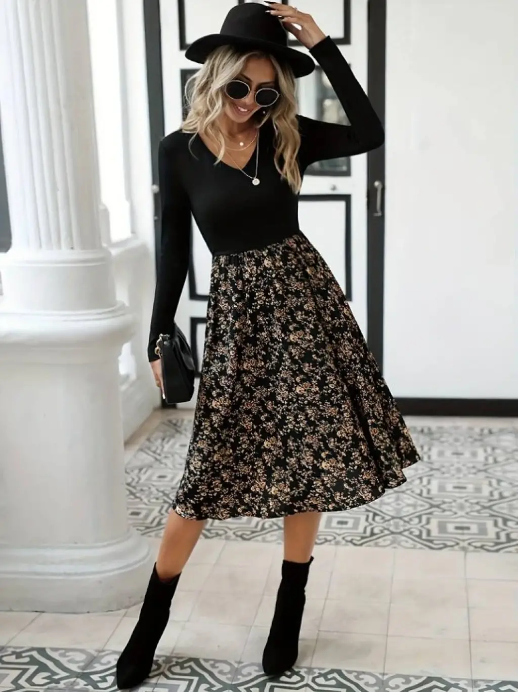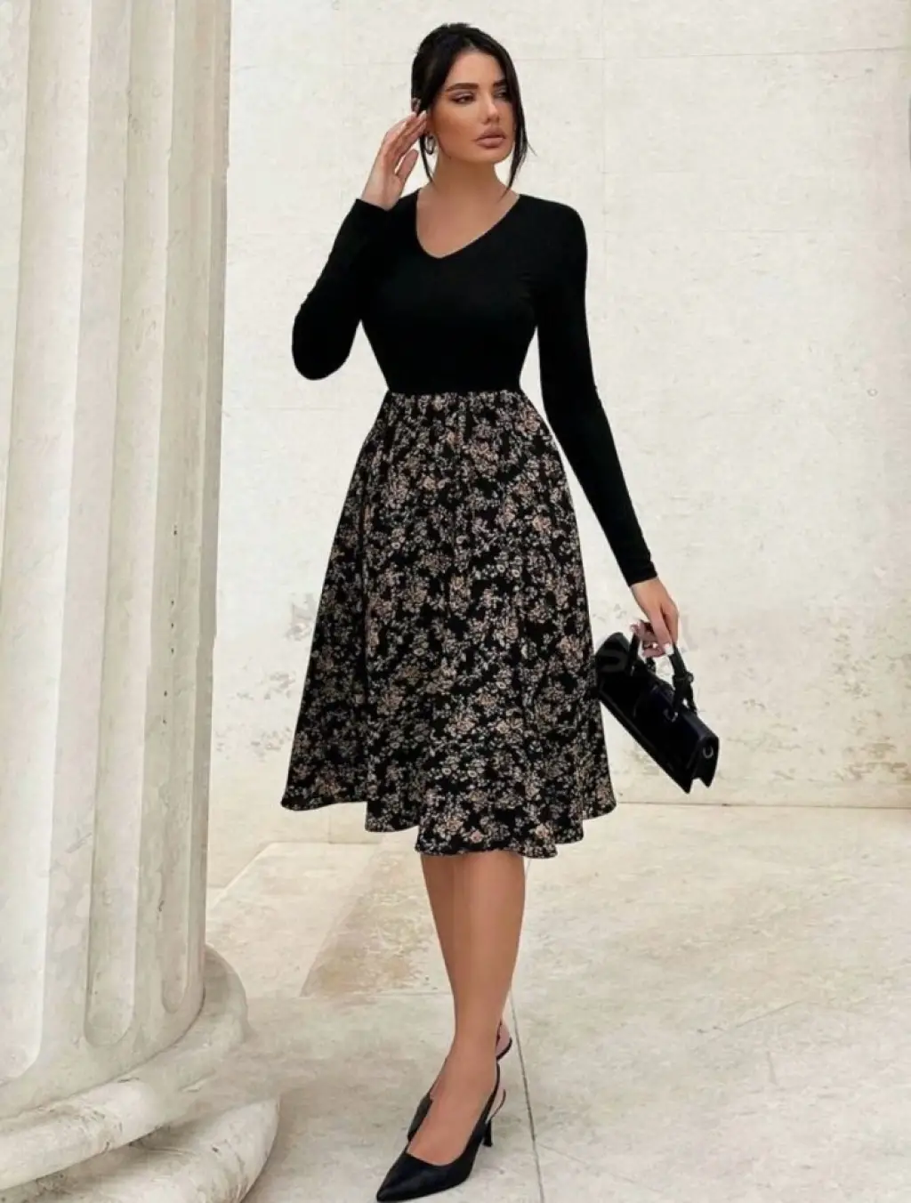 Kadın Uzun Kollu V Yakalı üst Viskon Alt çiçek Desenli Süprem Kısa Elbise