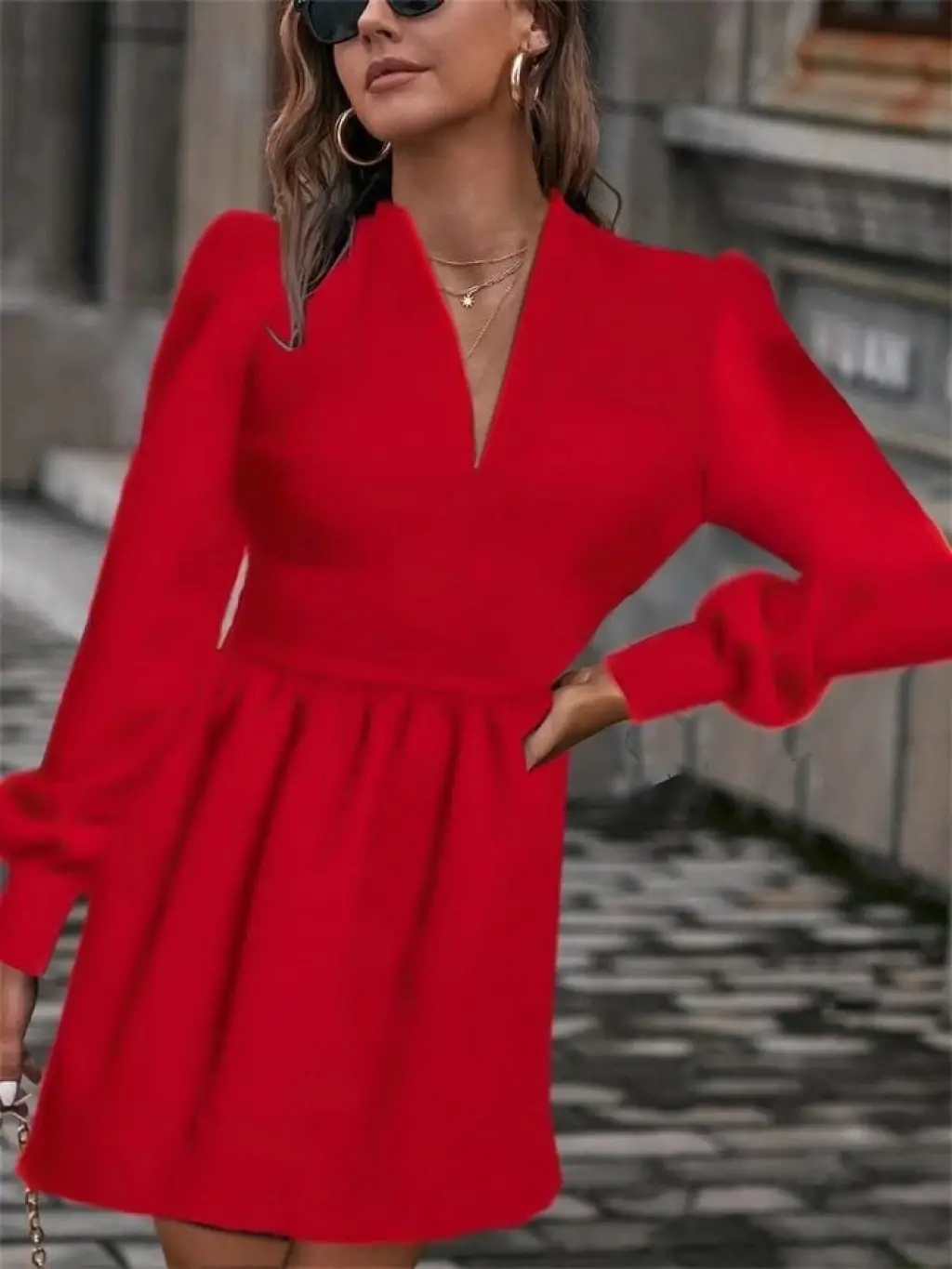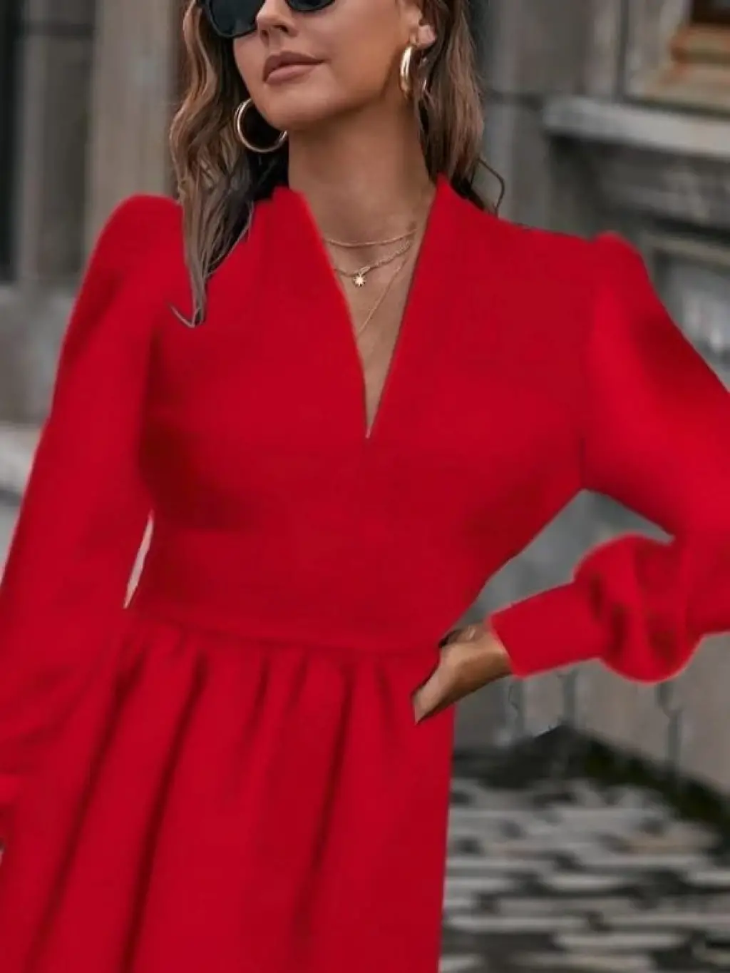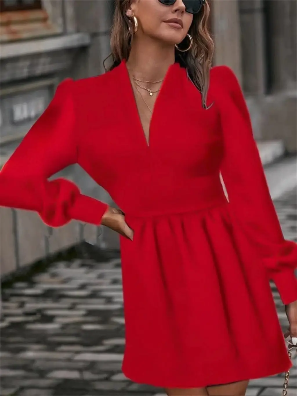 Kadın Uzun Kollu V Yaka Belden Hafif Pileli Scuba Krep Mini Boy Elbise