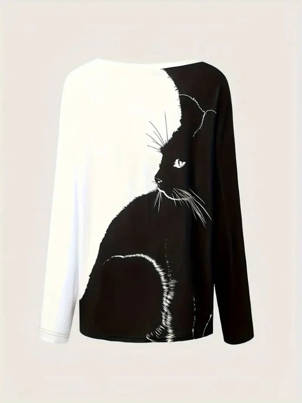 Kadın Uzun Kollu Bisiklet Yaka Kedi Baskılı şardonlu Dalgıç Bluz