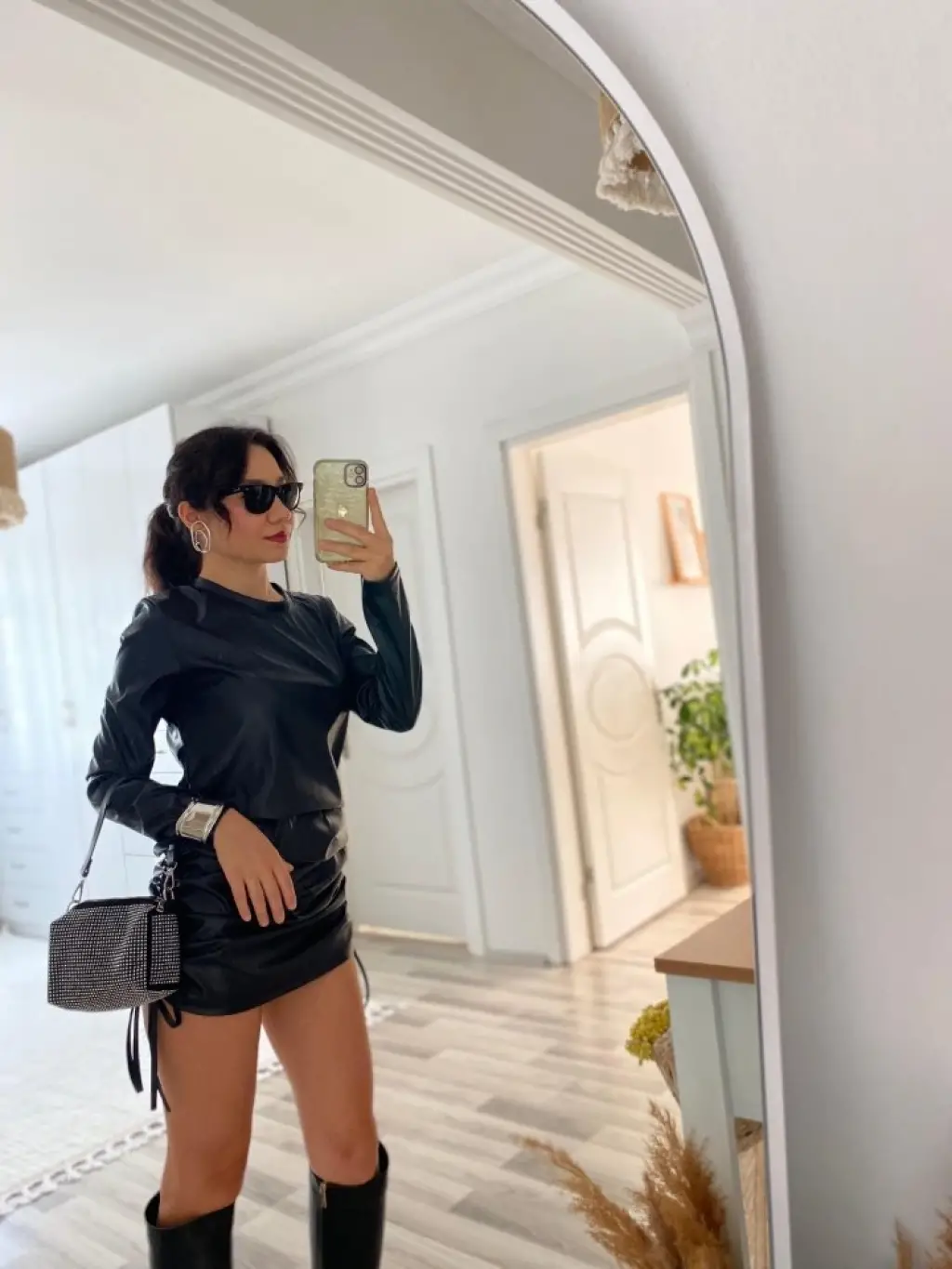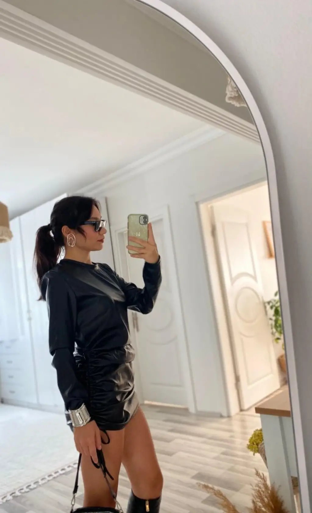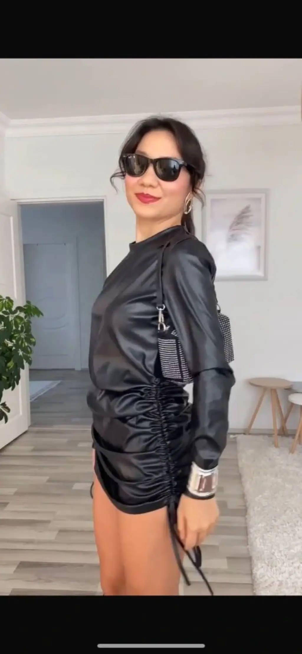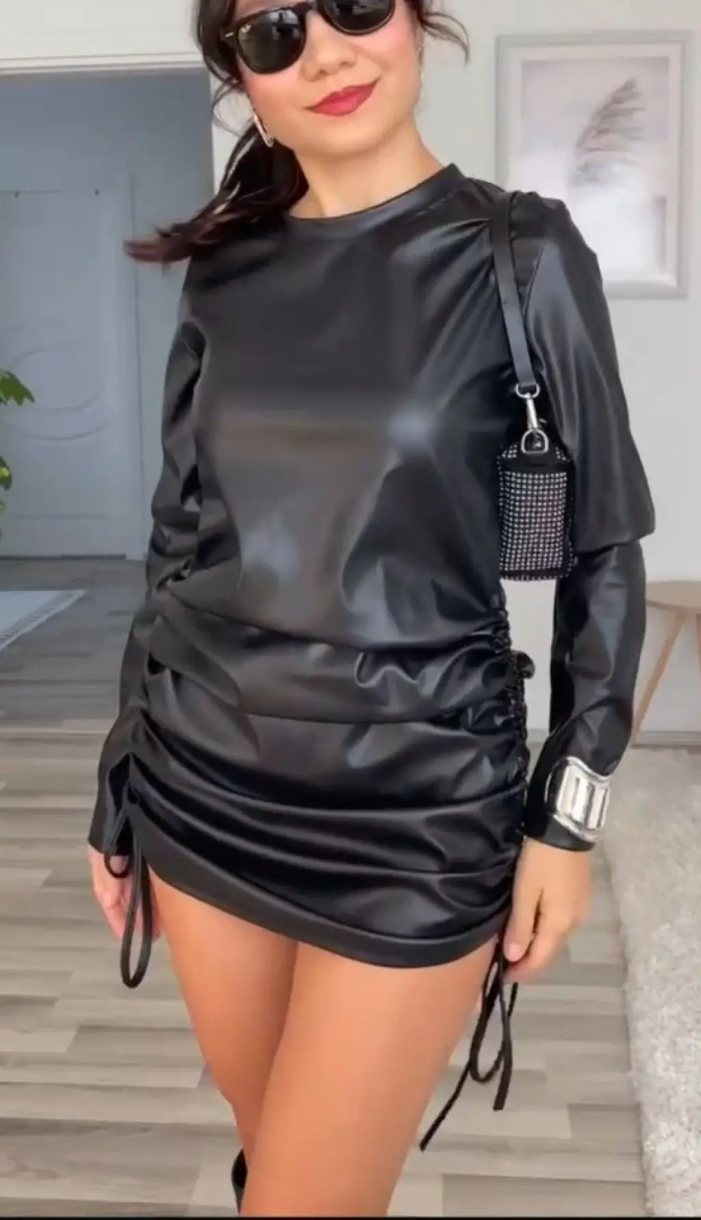 Kadın Uzun Kollu Bisiklet Yaka Yandan Büzgülü Kısa Deri Elbise
